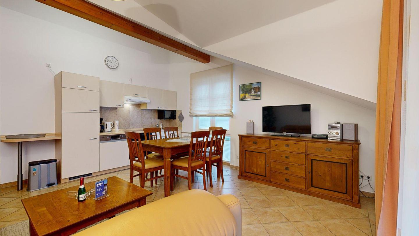 * Wohnzimmer: Couchgarnitur (Schlafcouch für 1-2 Pers.), Kabel-TV, Radio mit CD-Player, WLAN-Internetanschluss und Essplatz