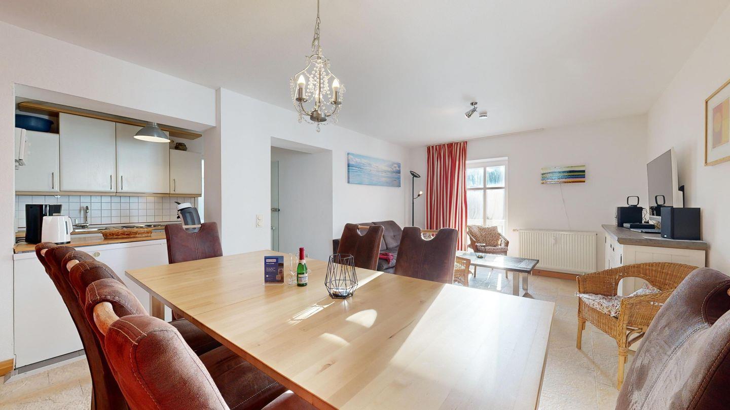 * Wohnzimmer: Couchgarnitur, Smart-TV, großer Esstisch mit Stühlen, WLAN-Internetanschluss, diverse Gesellschaftsspiele, kleine Bibliothek