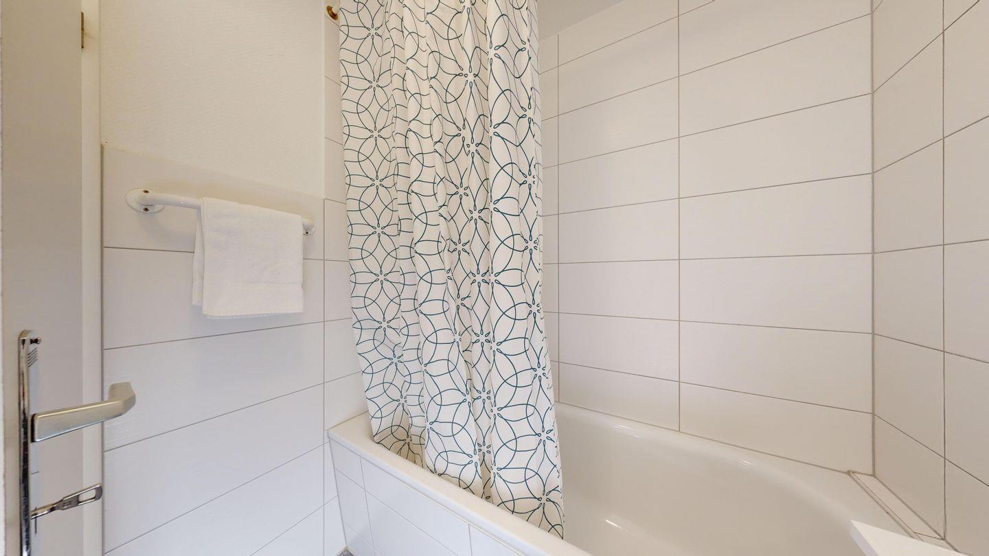* 1 Badezimmer mit Waschbecken, Badewanne, WC und Föhn