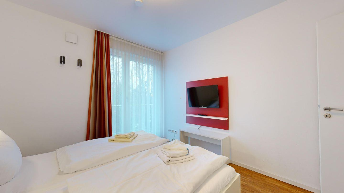 * 1 Schlafzimmer mit einem Doppelbett, TV, Balkon