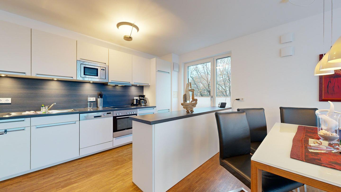 * Küche: Moderne Küchenzeile mit Ceran-Herd, Backofen, Spülmaschine, Mikrowelle, Kaffemaschine, Wasserkocher und Toaster