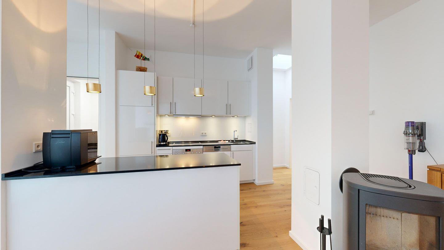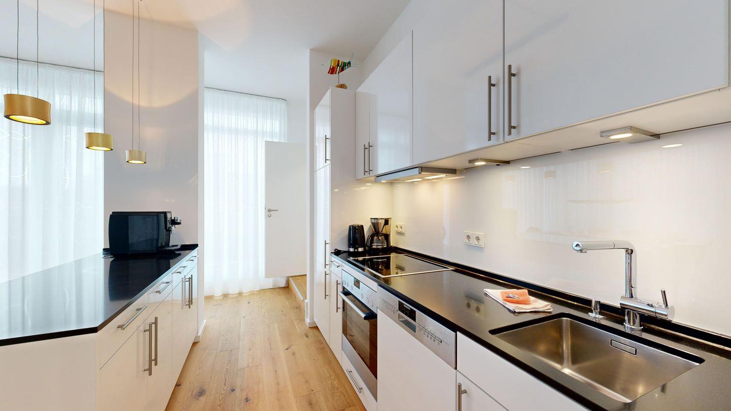 * Küche: Moderne Küchenzeile mit Ceran-Herd, Backofen, Spülmaschine, Wasserkocher, Kaffeevollautomat - verwendung mit Kaffeebohnen und eine Kaffeefiltermaschine, Toaster