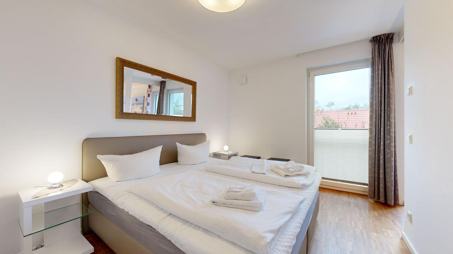 * 1 Schlafzimmer mit einem Doppelbett (Boxspringbett); Schiebetür zum Wohnzimmer.