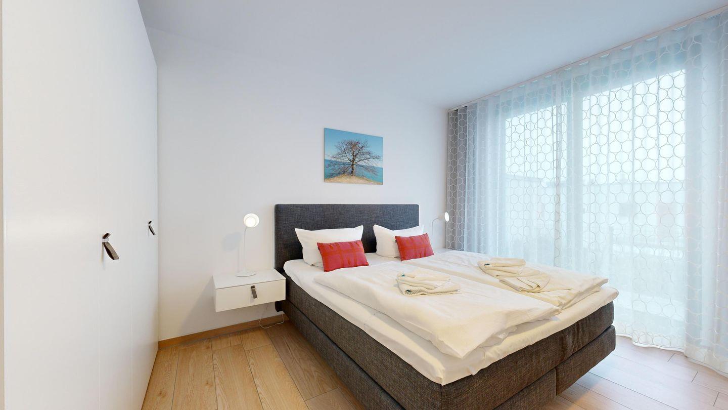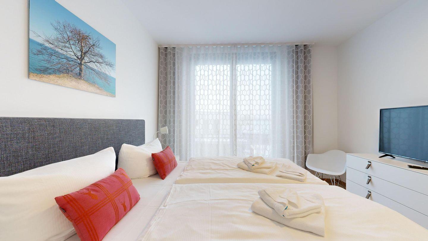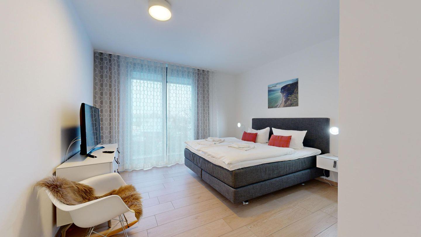 * 1 Schlafzimmer mit hochwertigem Doppelboxspringbett, TV (43 Zoll), Terrasse