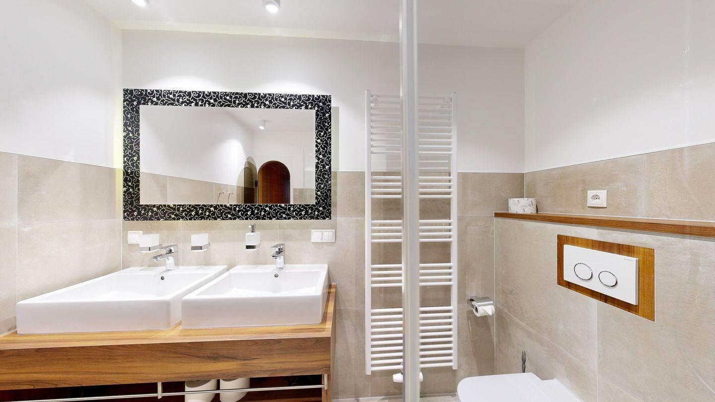 * ein großes Badezimmer mit Doppelwaschbecken, Dusche, WC, Sauna und Föhn