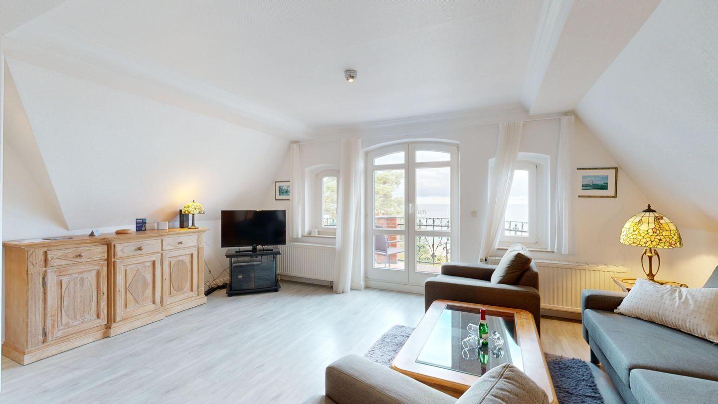* Wohnzimmer: Großes und helles Wohnzimmer mit fantastischem Meerblick; gemütliche Couchgarnitur, Kabel-Flachbild TV, DVD-Player, WLAN-Internetanschluss und Balkon zum Meer