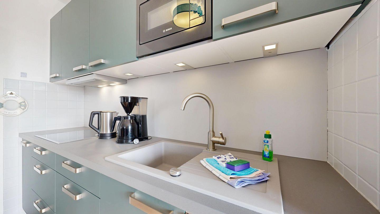 * Küchenzeile mit Spülmaschine, Ceranfeld, Mikrowelle, Kaffeemaschine, Toaster und Kühlschrank mit Gefrierfach