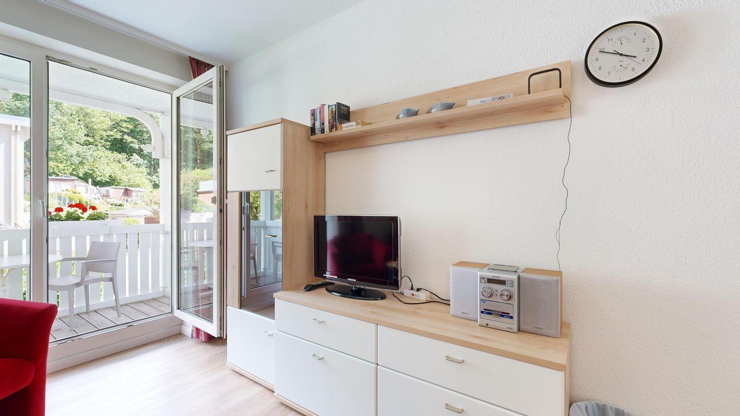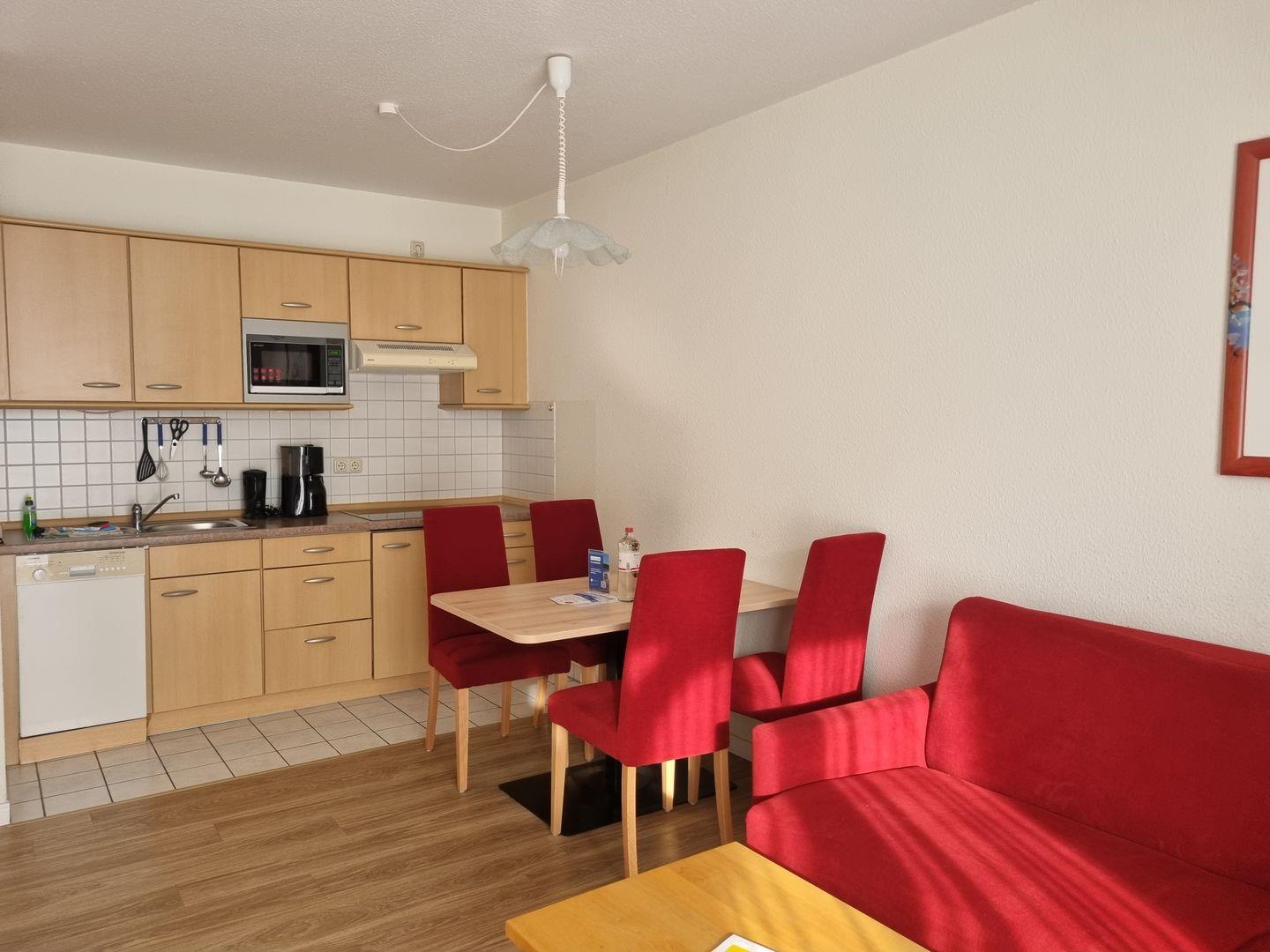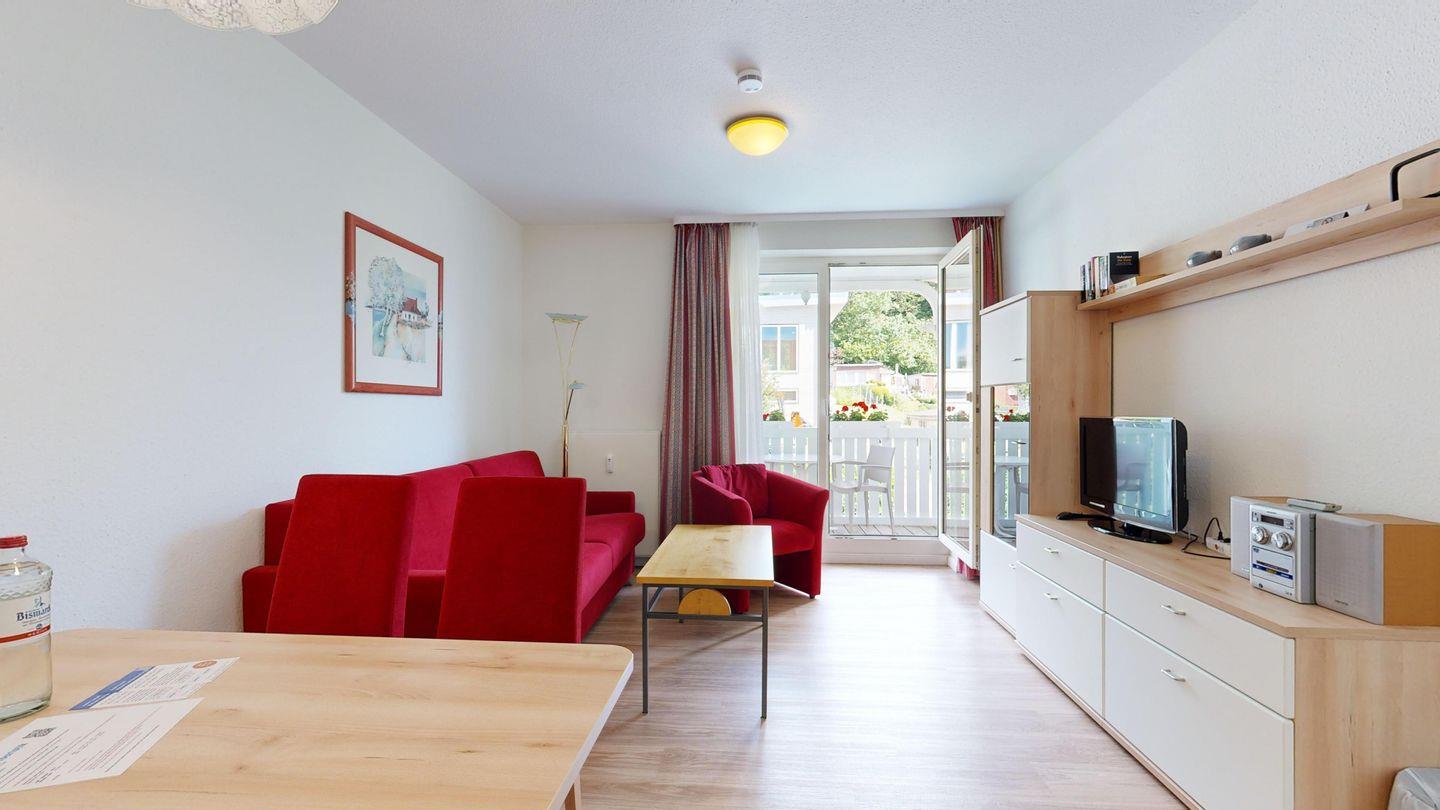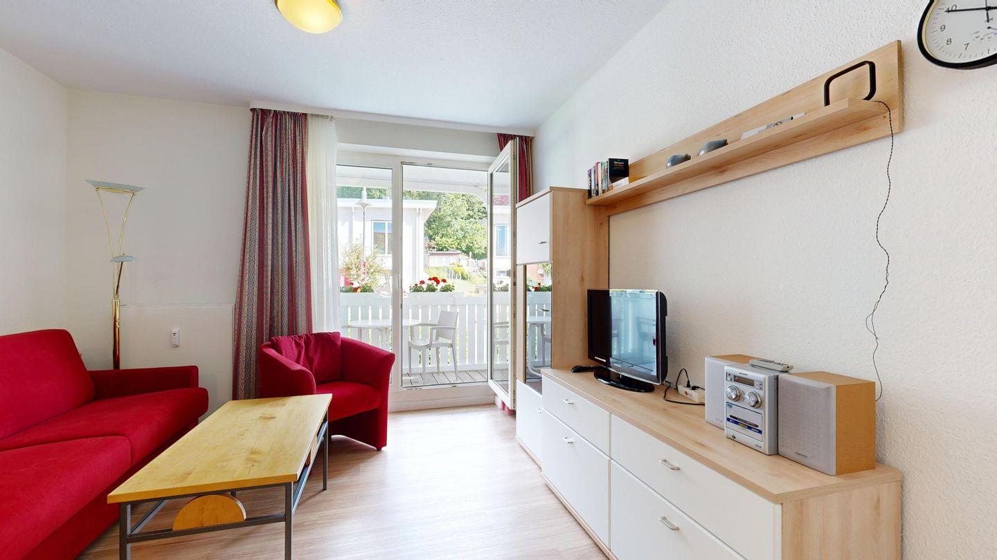 * Wohnzimmer: Couchgarnitur (Schlafgelegenheit für 2 Personen), Kabel-TV, Stereoanlage, Internetanschluss (WLAN), Esstisch