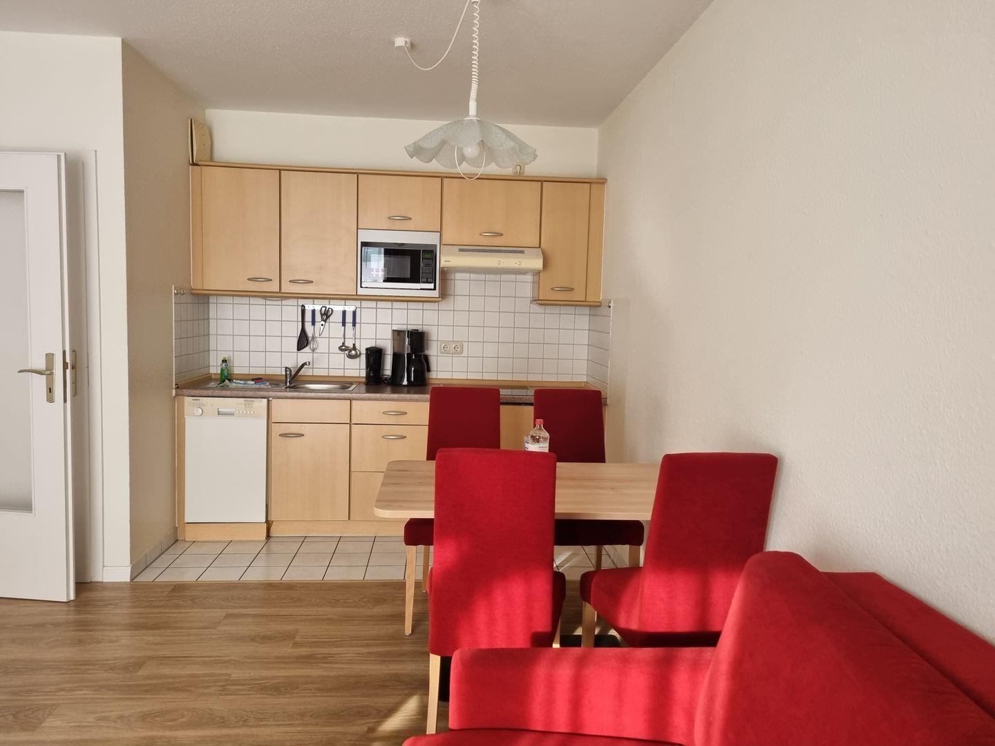* Küchenzeile mit Spülmaschine, Ceranfeld, neuer Mikrowelle (02.2026) , Kaffeemaschine, Toaster und Kühlschrank mit Gefrierfach
