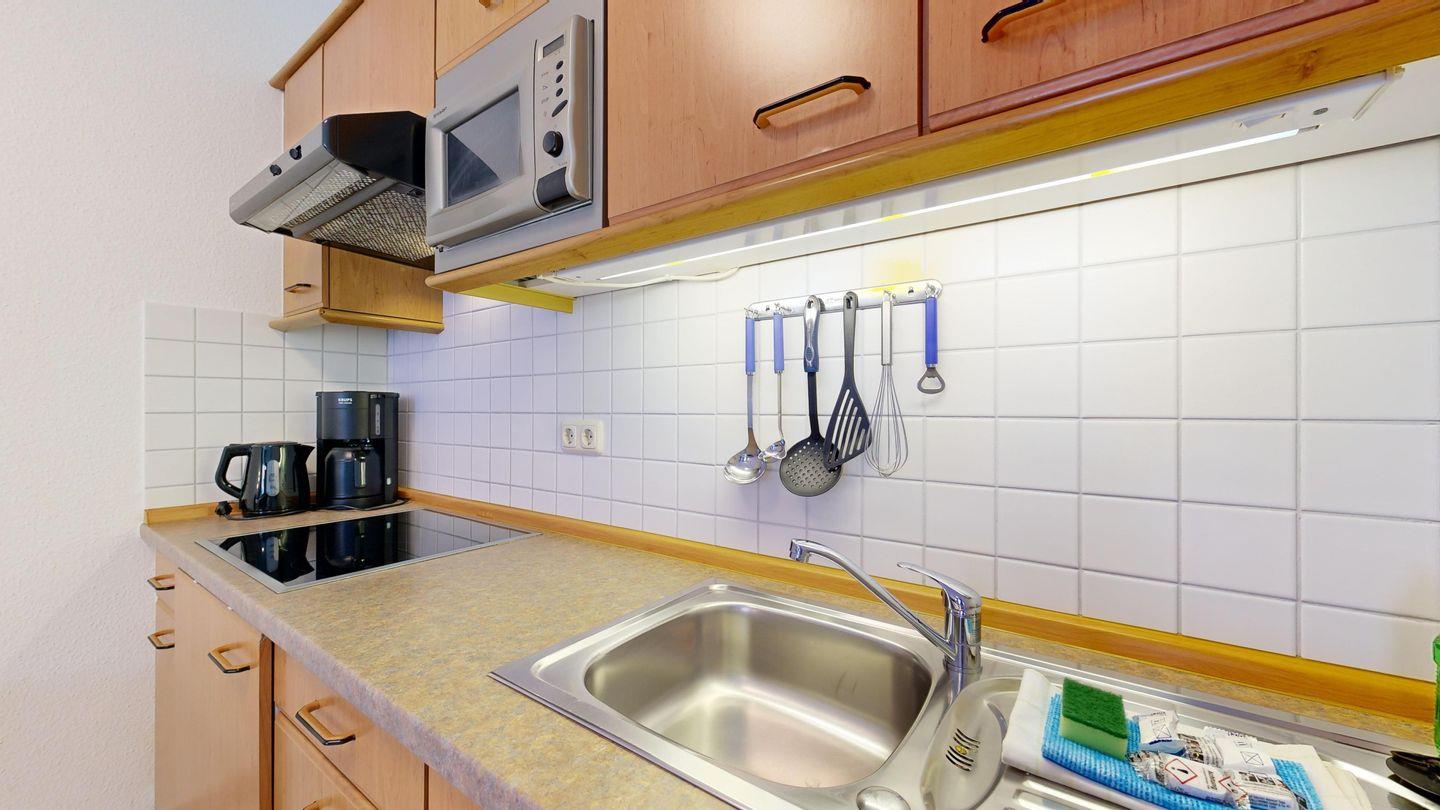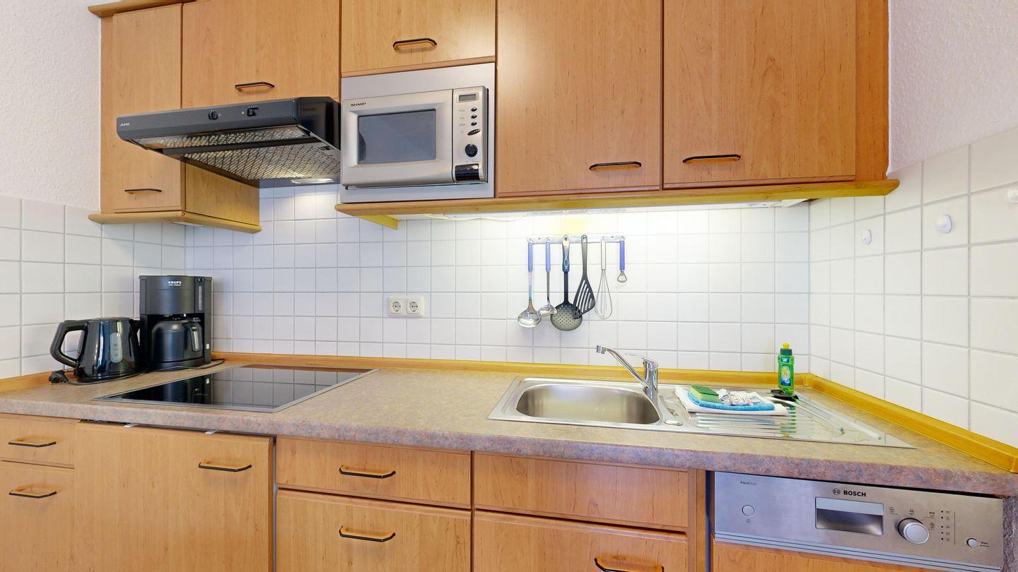 * Küchenzeile mit Spülmaschine, Ceranfeld, Mikrowelle, Kaffeemaschine, Toaster und Kühlschrank mit Gefrierfach