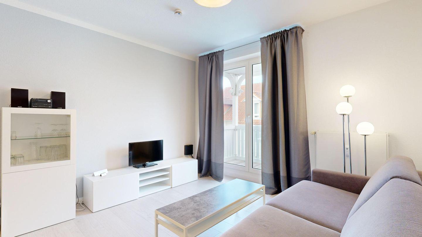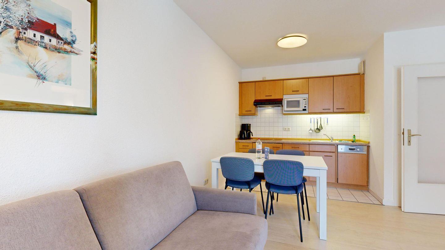* Wohnzimmer: Couchgarnitur (Schlafgelegenheit für 2 Personen), Kabel-TV, Stereoanlage, Internetanschluss (WLAN), Esstisch