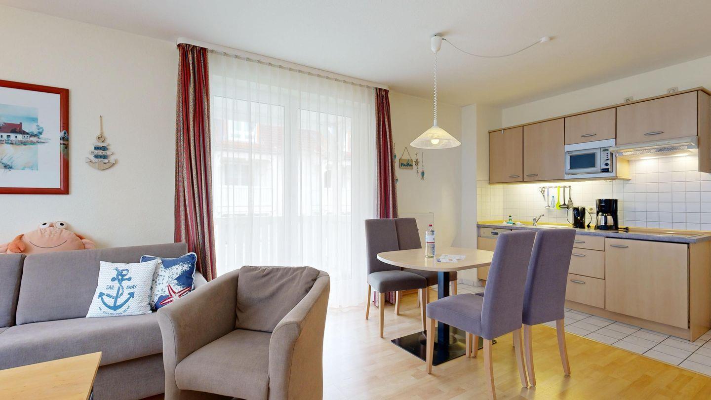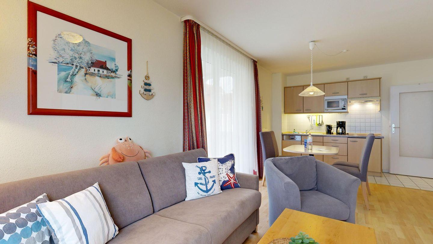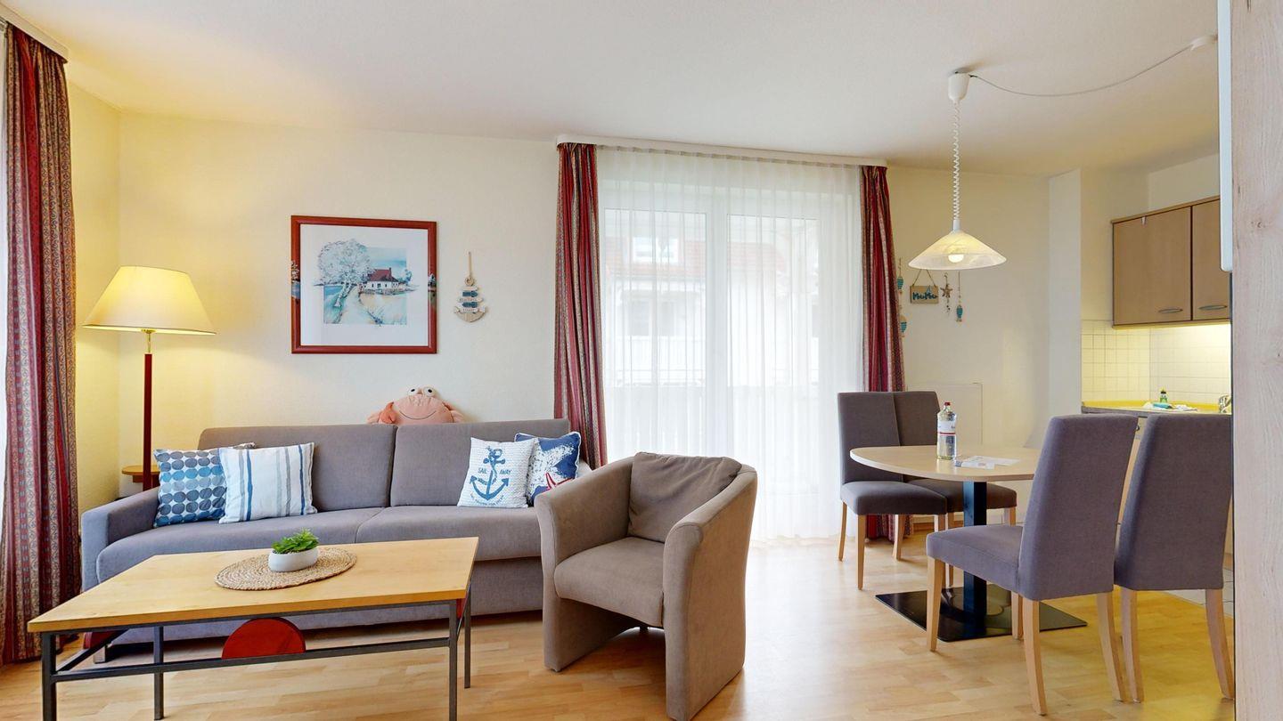 * Wohnzimmer: Couchgarnitur (Schlafgelegenheit für 2 Personen), Kabel-TV, Stereoanlage, Internetanschluss-WLAN, Esstisch