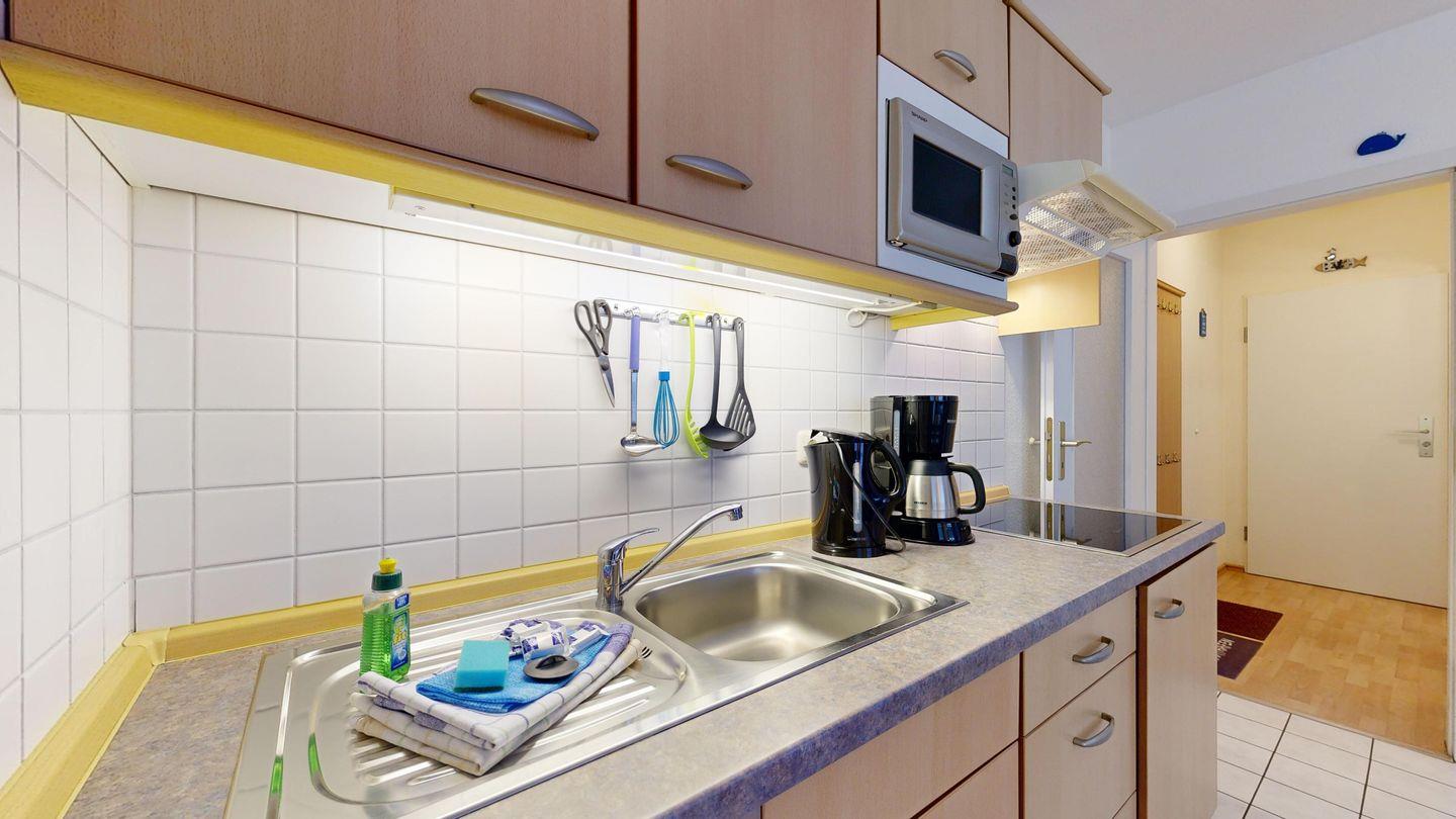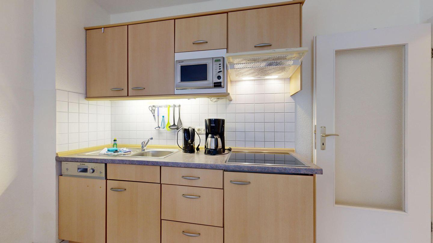 * Küchenzeile mit Spülmaschine, Ceranfeld, Mikrowelle, Kaffeemaschine, Toaster und Kühlschrank mit Gefrierfach