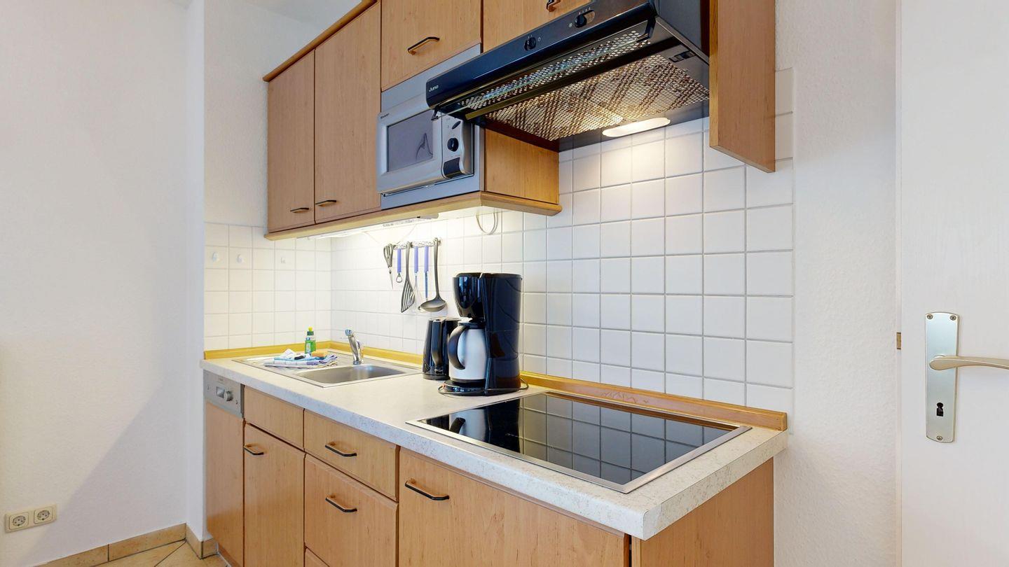 * Küchenzeile mit Spülmaschine, Ceranfeld, Mikrowelle, Kaffeemaschine, Toaster und Kühlschrank mit Gefrierfach