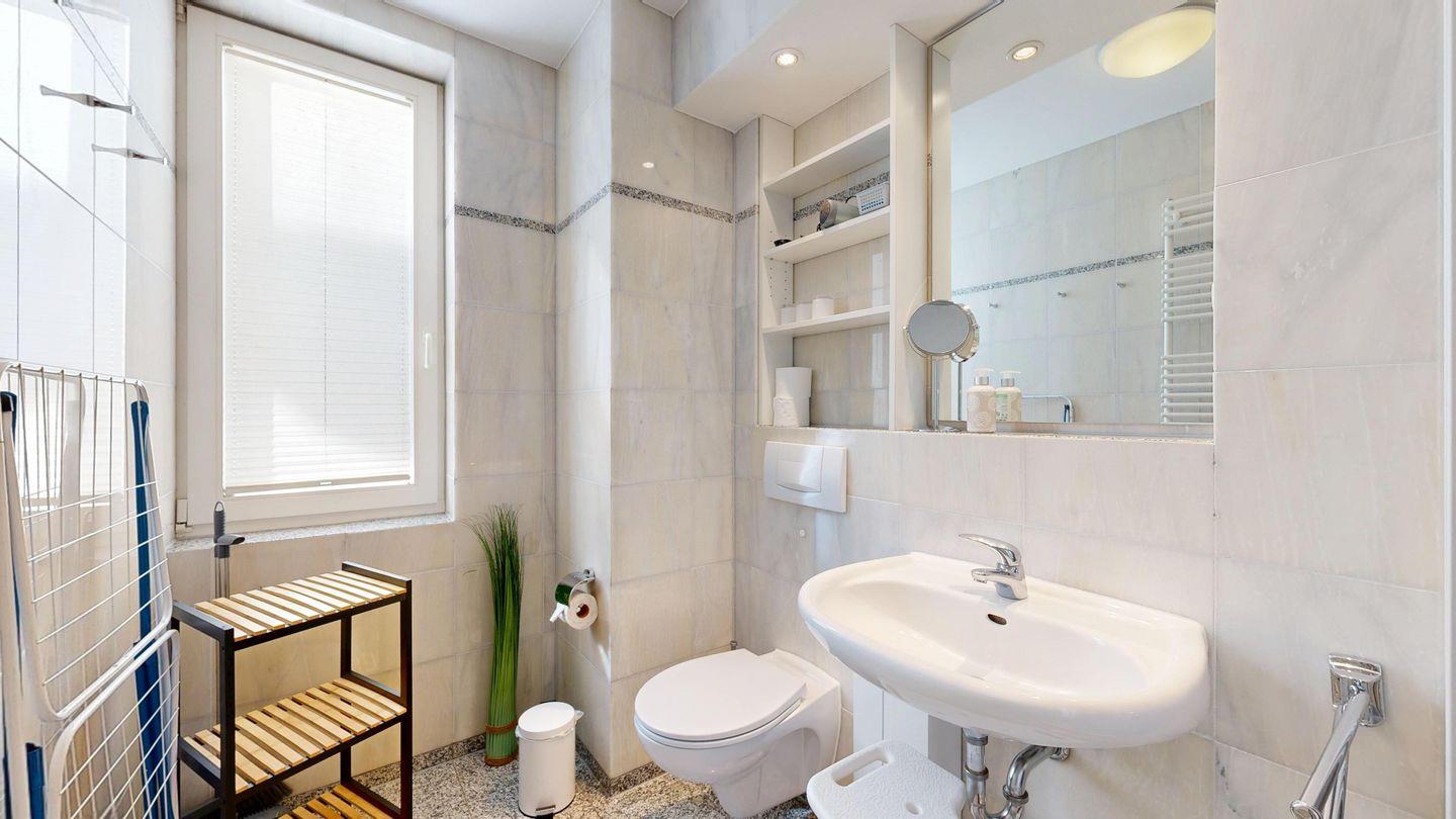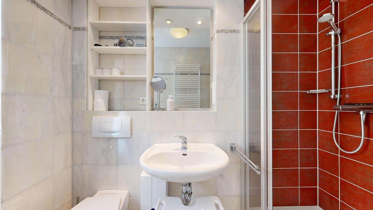 * 1 Badezimmer mit Dusche, WC, Föhn und Duschhocker