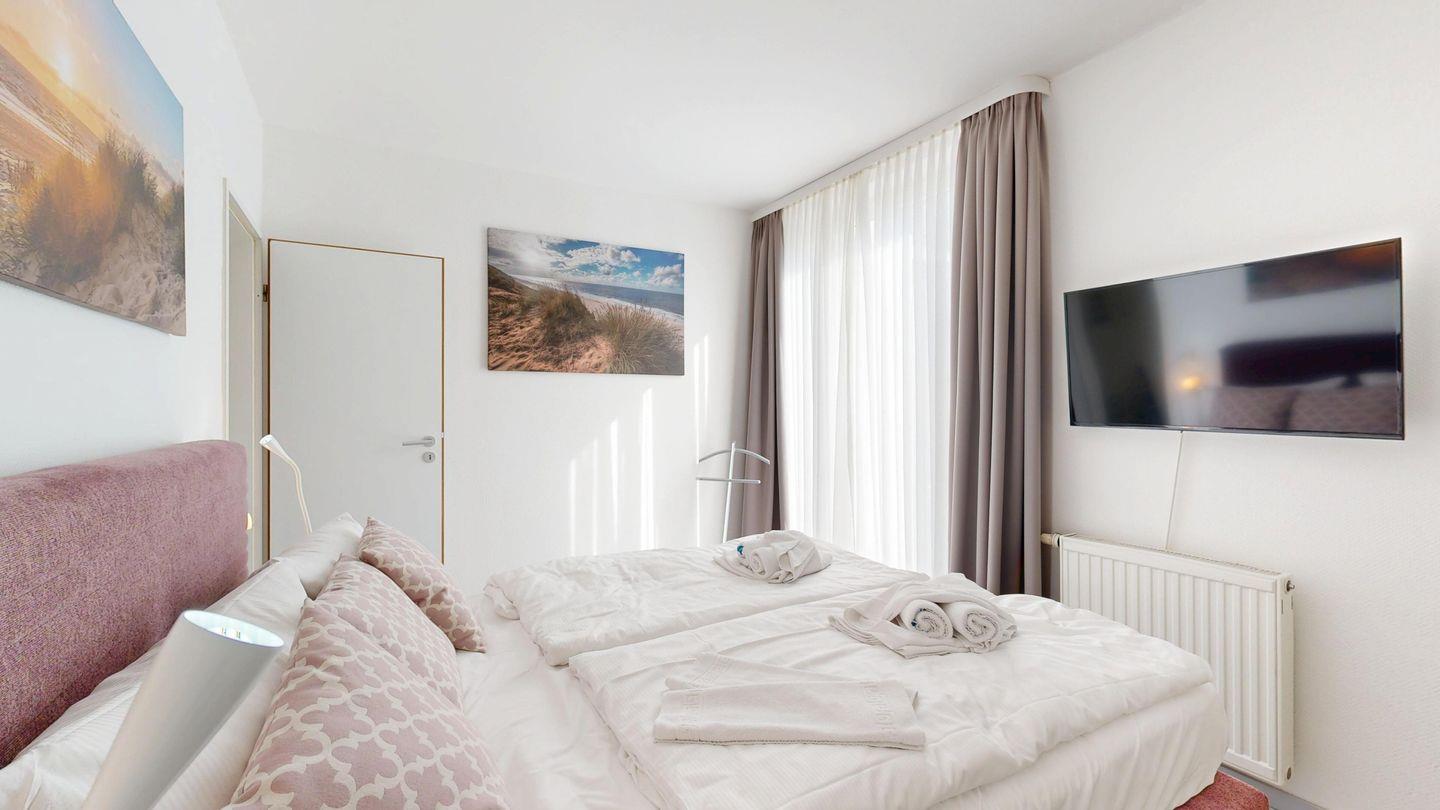 * 1 Schlafzimmer mit einem Doppelbett (Breite 1,60m), TV und Zugang zum Balkon