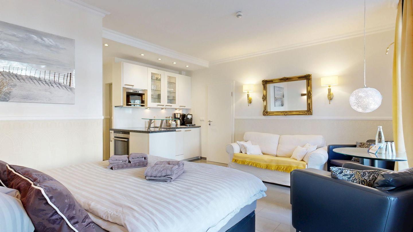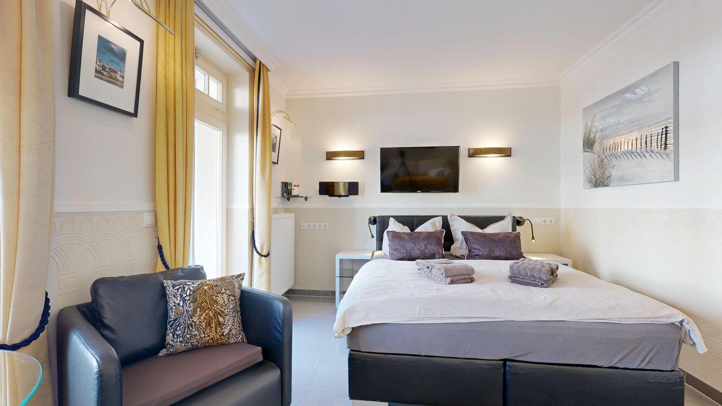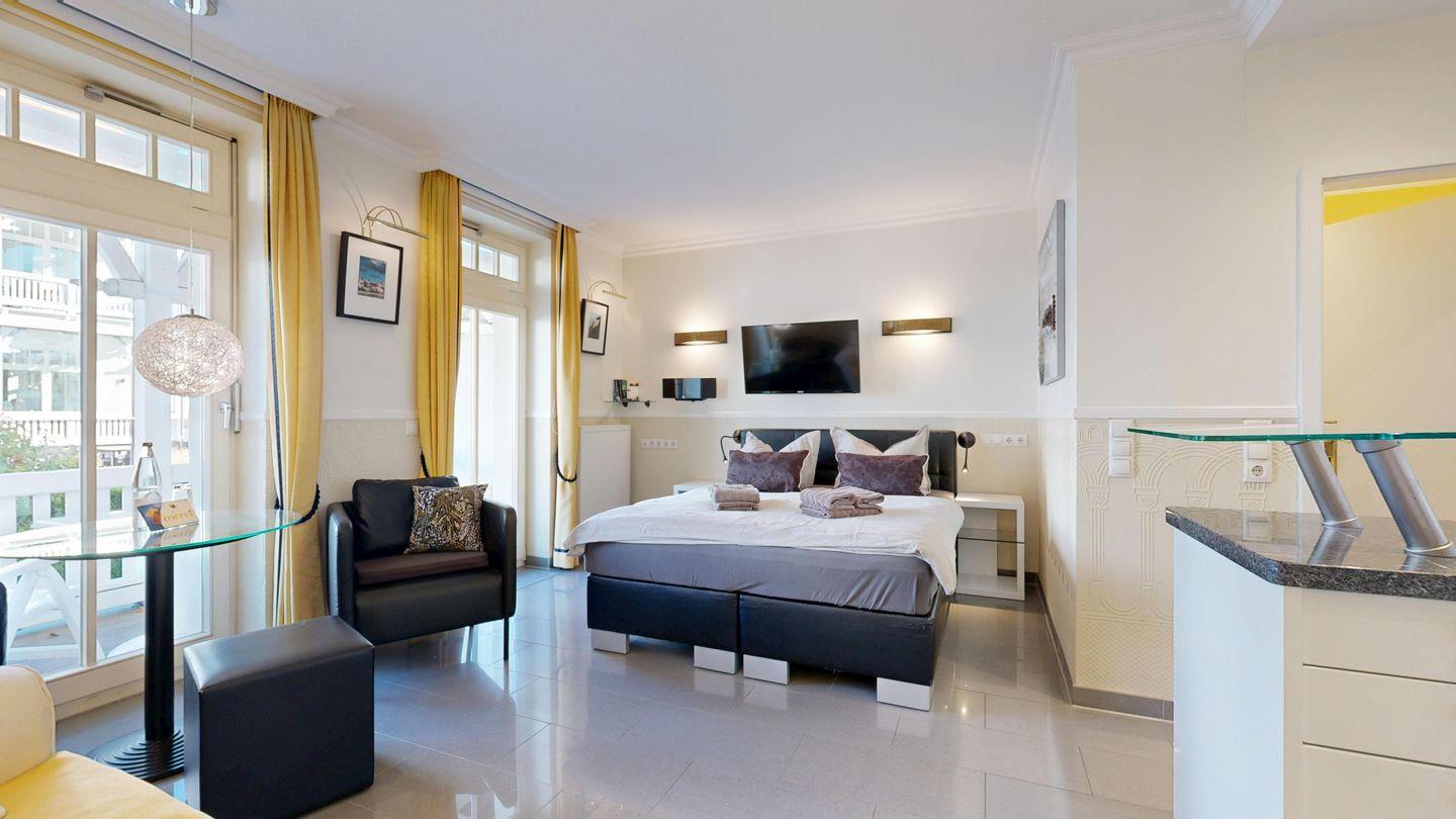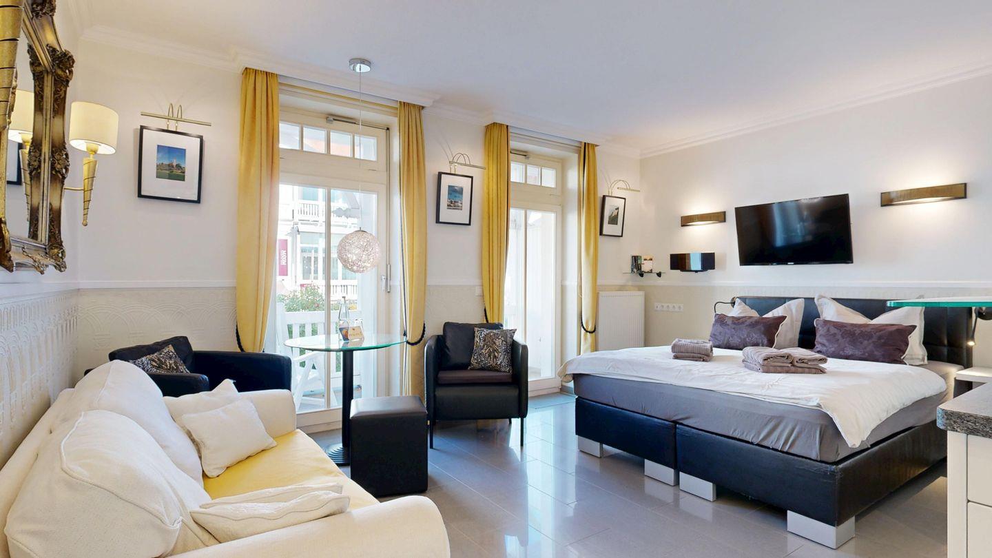 * Wohn- Schlafraum mit Doppelbett und Sofa. Außerdem gibt es einen kleinen Tisch mit 2 gemütlichen Sesseln, Kabel-TV, WLAN-Internetanschluss und einen Balkon
