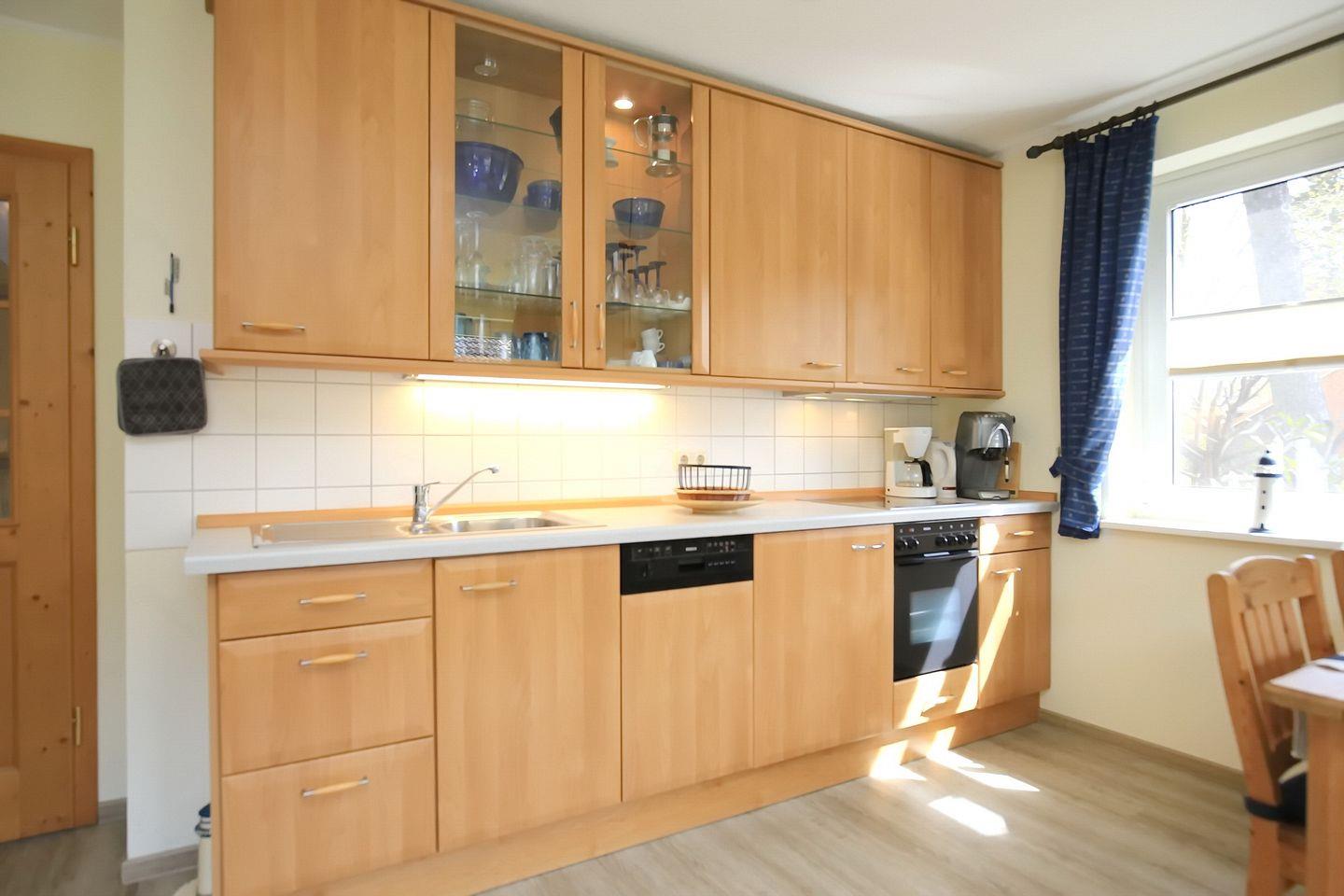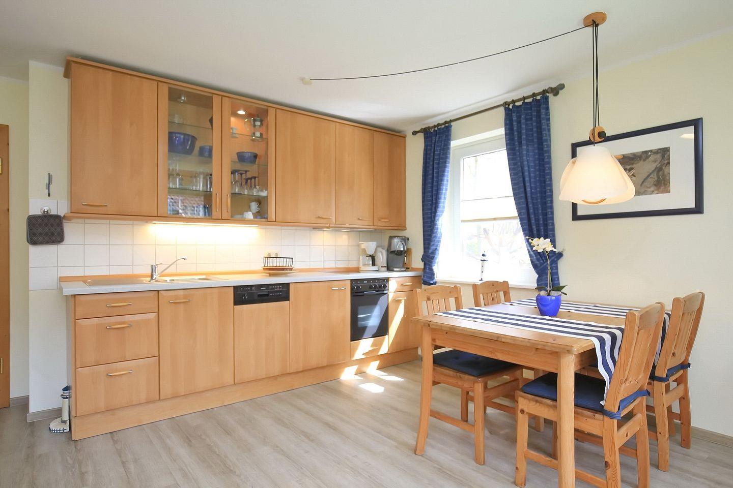 Die Küchenzeile ist mit Spülmaschine, Mikrowelle und einem 4-Platten-Cerankochfeld mit Backofen ausgestattet. Ein gemütlicher Essplatz befindet sich in unmittelbarer Nähe der Küchenzeile. Selbstverständlich hat dieses Ferienhaus ein Duschbad inklusive Waschmaschine.