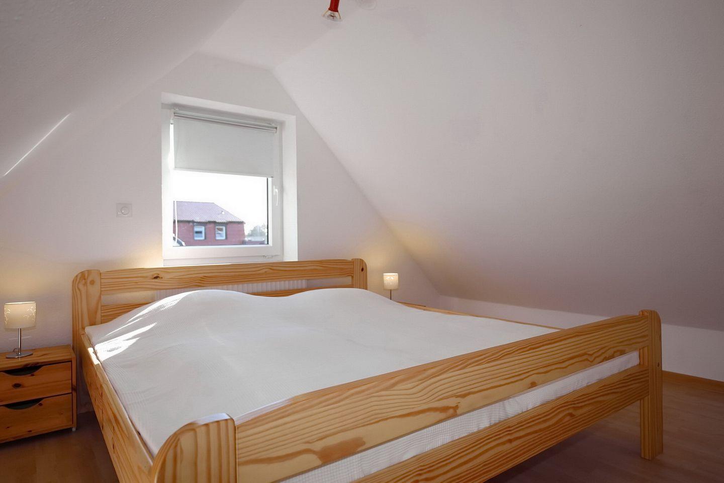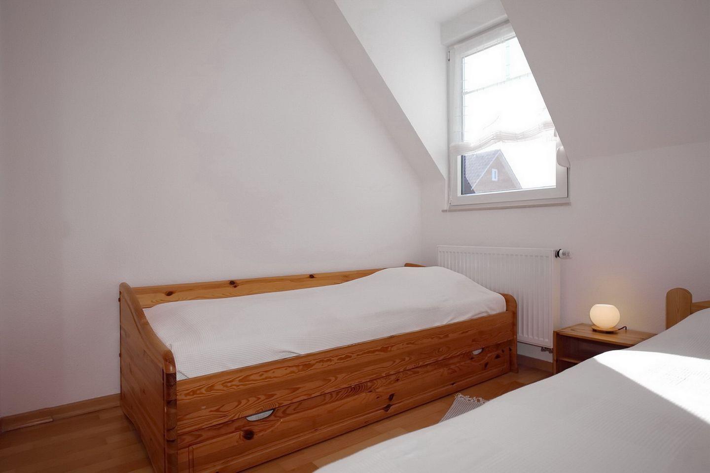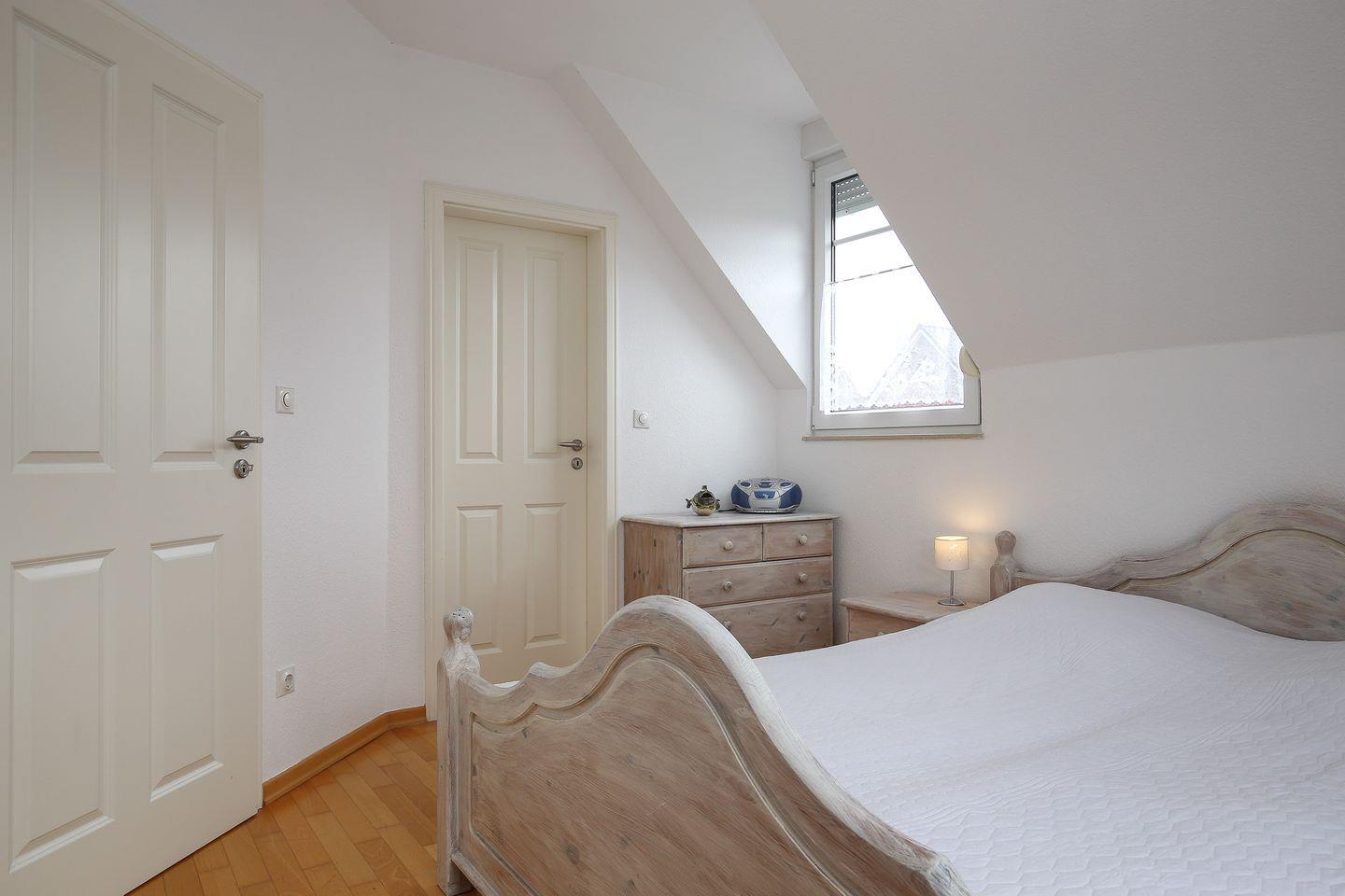Im Dachgeschoss befindet sich das 3. Schlafzimmer (Schrägen vorhanden) und ist mit 1 Doppelbett (Maße 2x90x200 cm) eingerichtet.