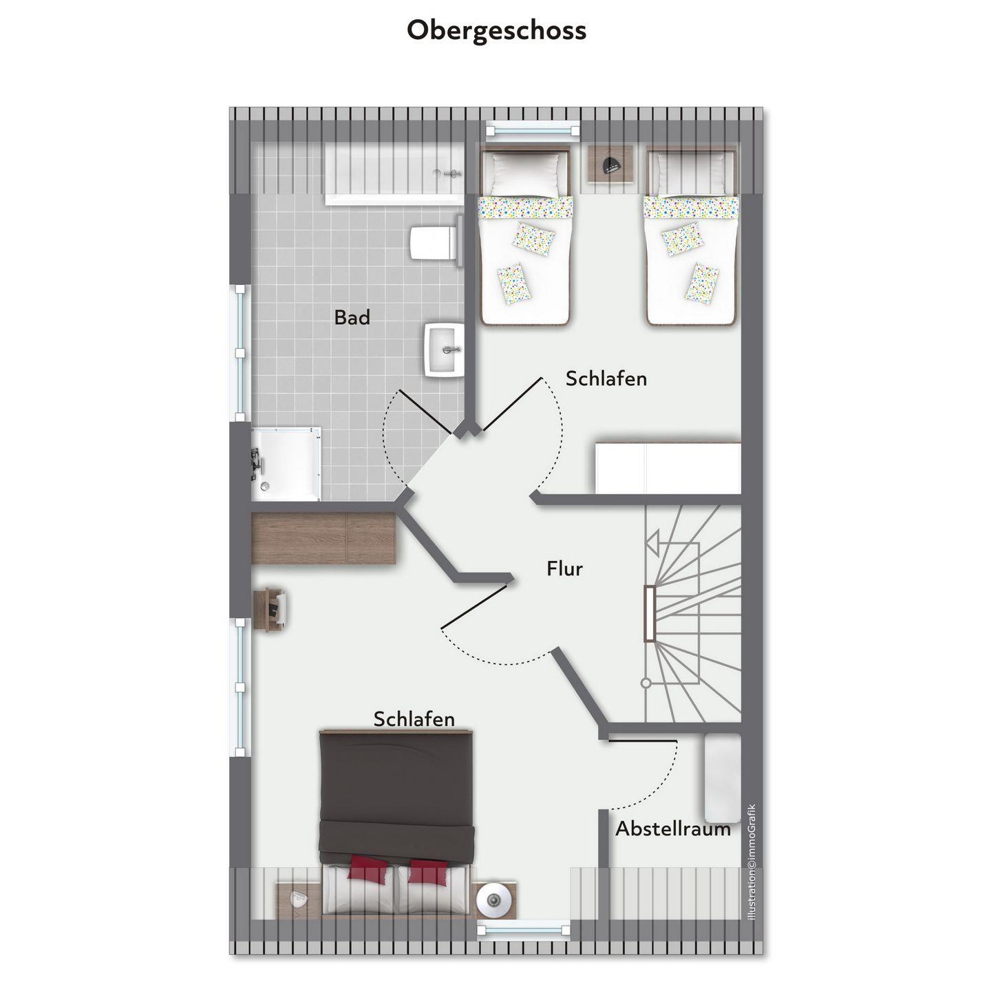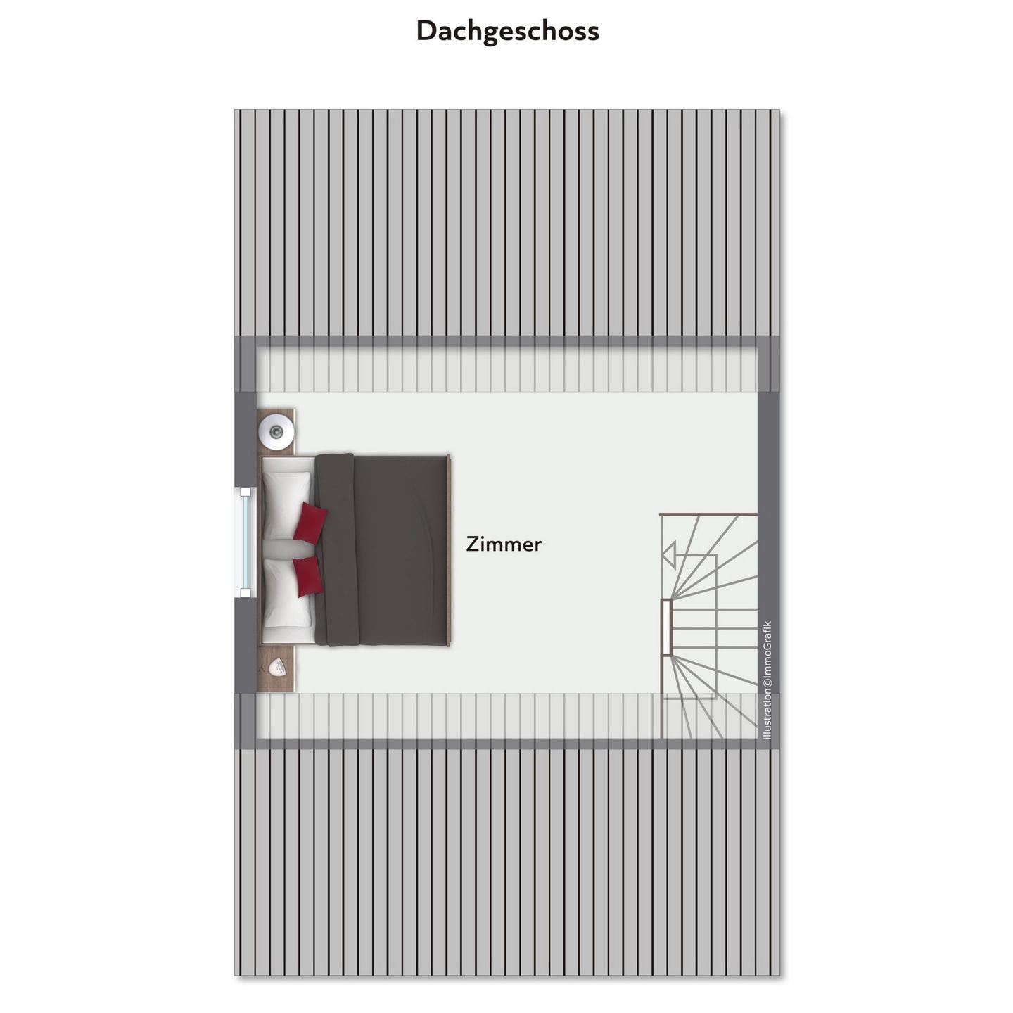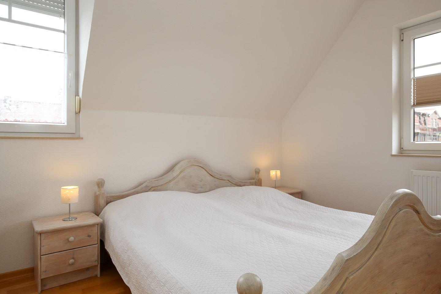 Im Dachgeschoss befindet sich das 3. Schlafzimmer (Schrägen vorhanden) und ist mit 1 Doppelbett (Maße 2x90x200 cm) eingerichtet.