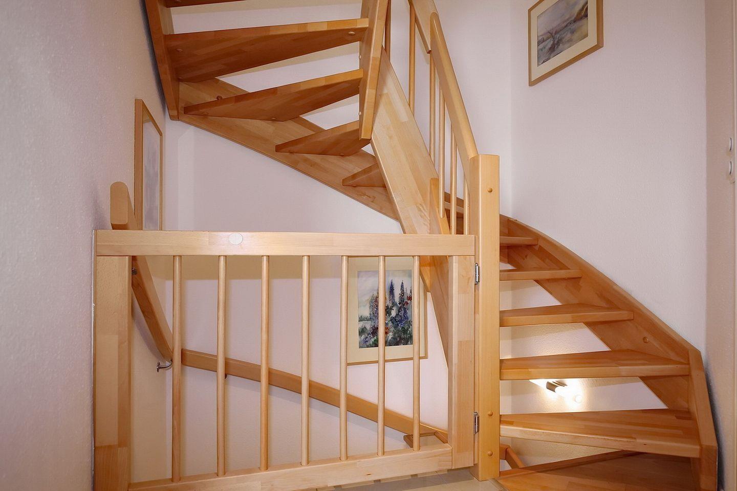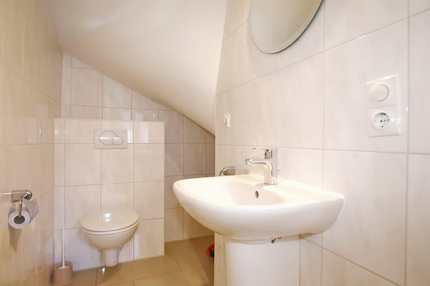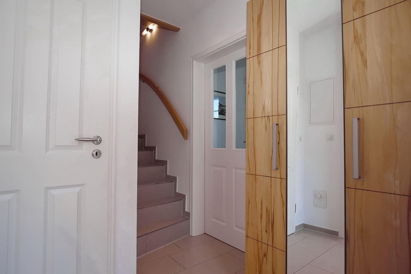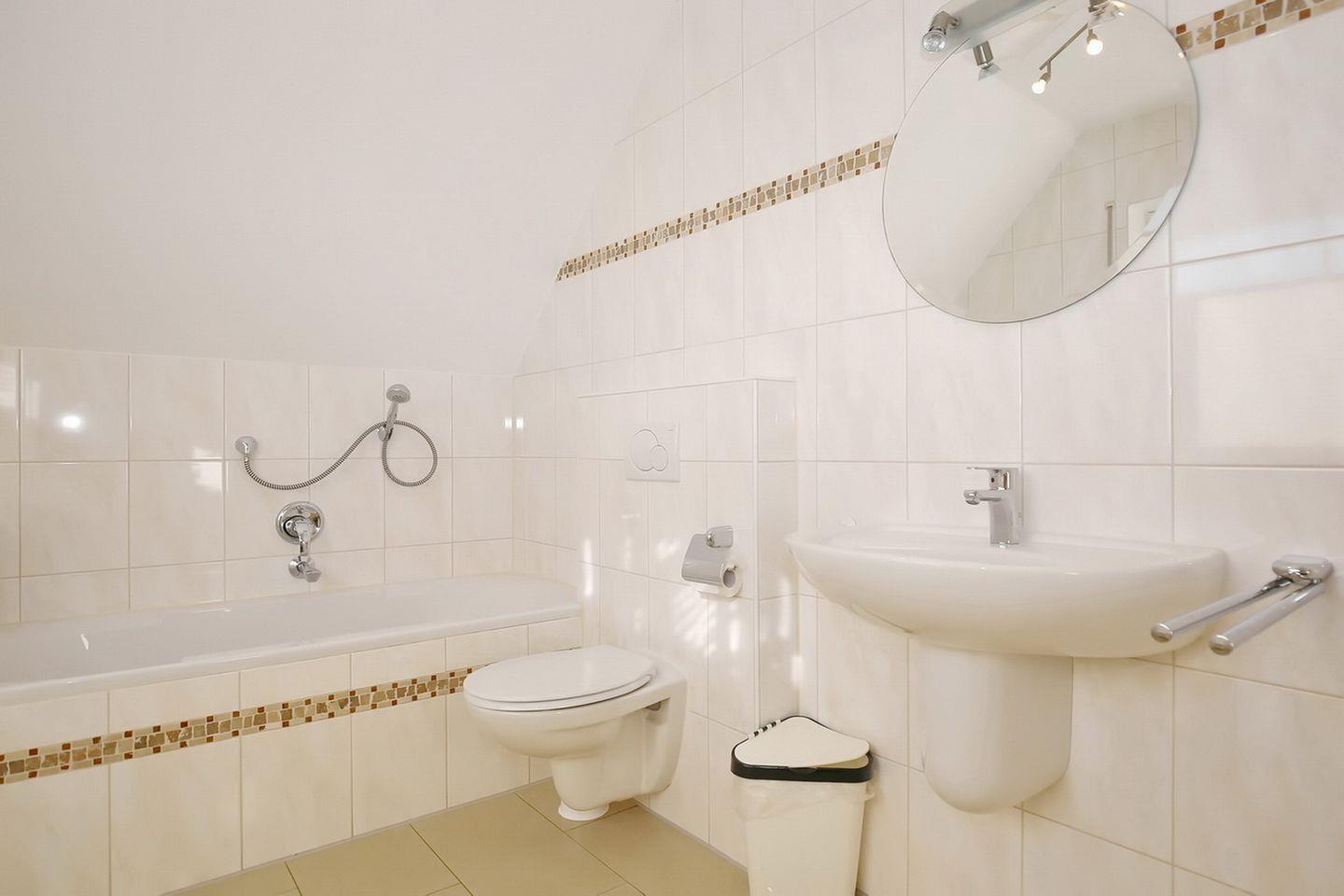 Drei Schlafzimmer sind auf den oberen Etagen verteilt. In der zweiten Etage befindet sich ein geräumiges Badezimmer mit Dusche, Badewanne, WC und Wickeltischauflage. Darüber hinaus kannst du auch die vorhandene Waschmaschine nutzen. Besonders angenehm ist hier die Fußbodenheizung.