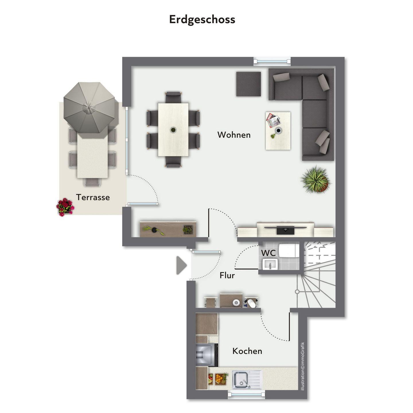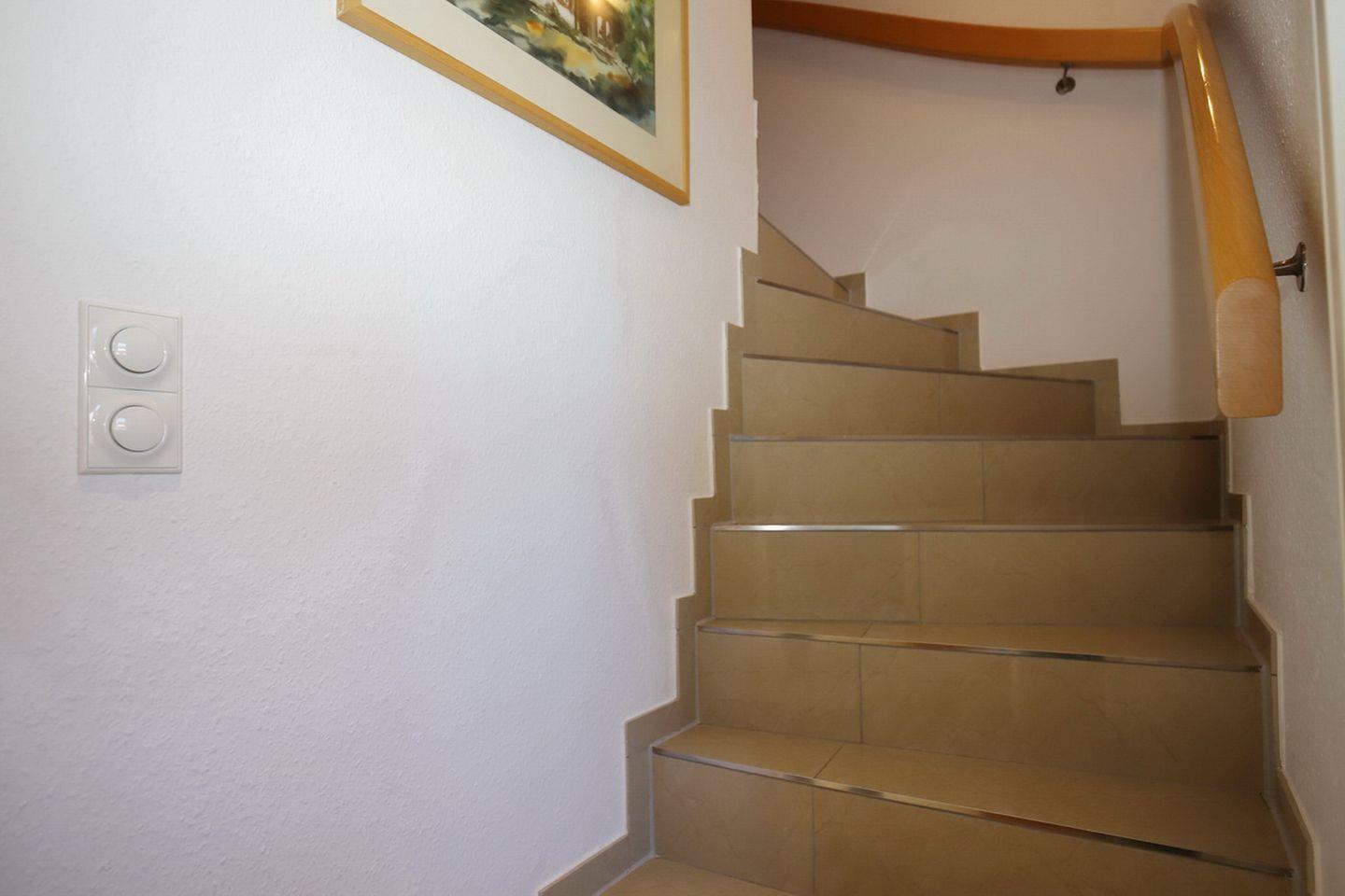 Im Erdgeschoss befindet sich ein Wohn- und Essbereich sowie die separat gelegene Küche. Flachbildfernseher mit Sat-TV, DVD-Player, eine Stereoanlage und ein Radio sind vorhanden. Die Küche, die über alle notwendigen Küchengeräte verfügt, liegt direkt neben dem Wohnbereich. Zudem ist im Erdgeschoss ein Gäste-WC vorhanden. Für den Bodenbelag im Erdgeschoss wurden Fliesen gewählt.