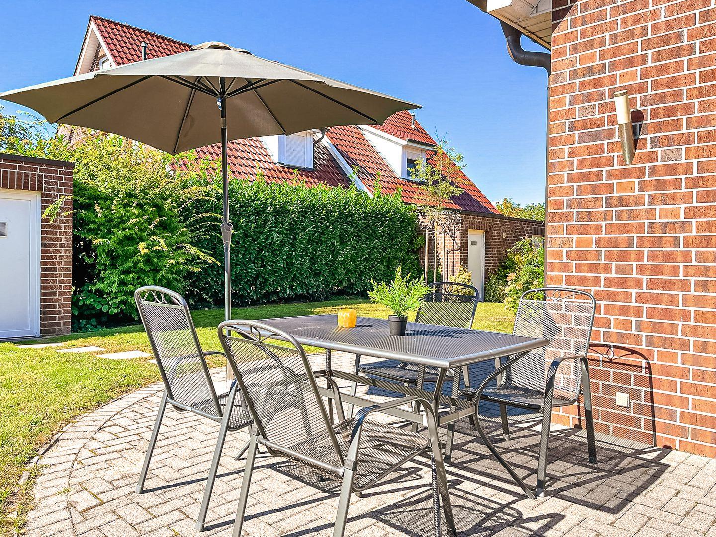 Zu diesem Ferienhaus gehört ein Garten mit Terrasse. Die möblierte Terrasse lädt dazu ein, einen gemütlichen Abend gemeinsam zu verbringen.