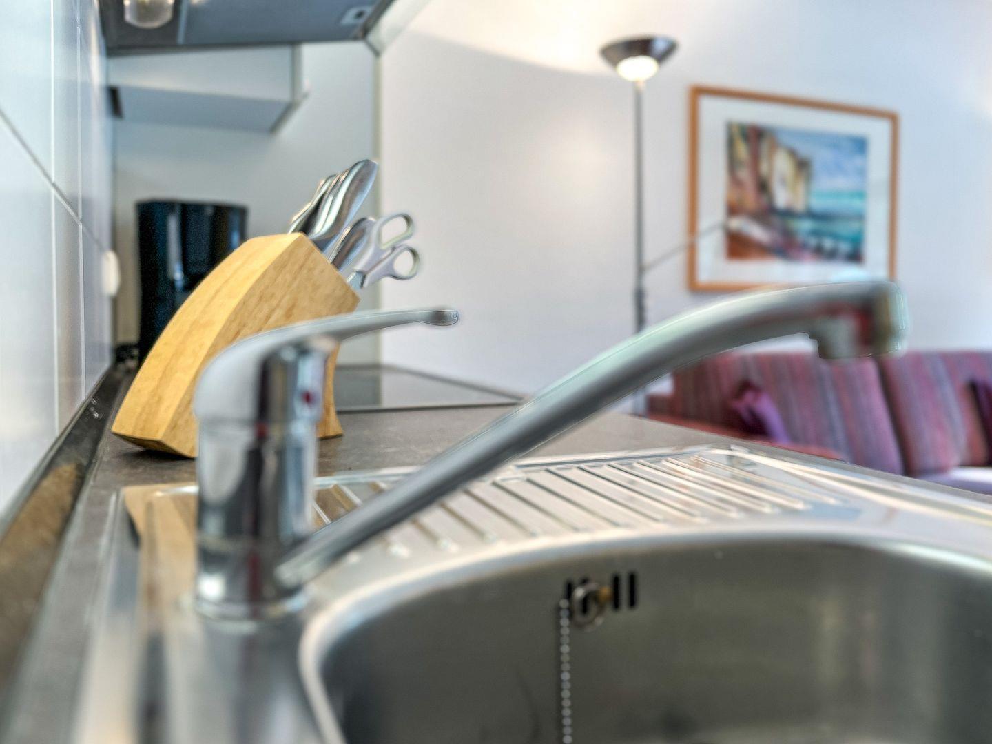 Die Küchenzeile verfügt über einen 4-Platten-Cerankochfeld, eine Dunstabzugshaube sowie einen Backofen. Weiterhin sind Geschirrspüler, Kühlschrank mit Gefrierfach, Mikrowelle, Wasserkocher, Kaffeemaschine, Toaster und Eierkocher vorhanden.