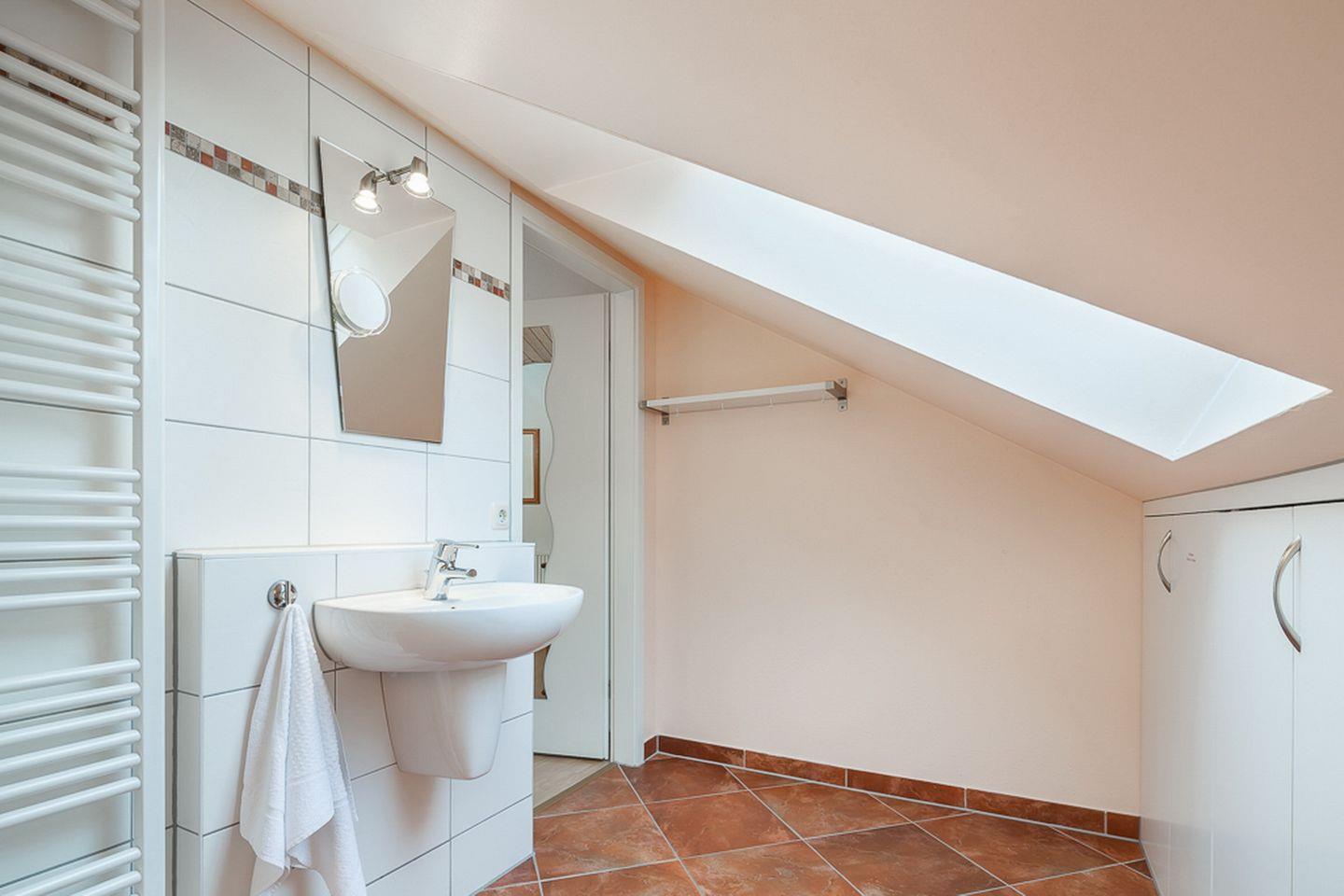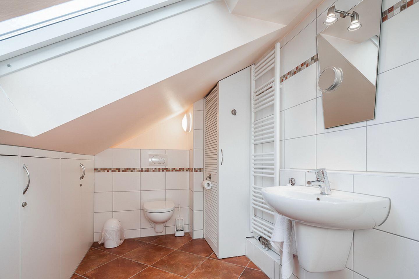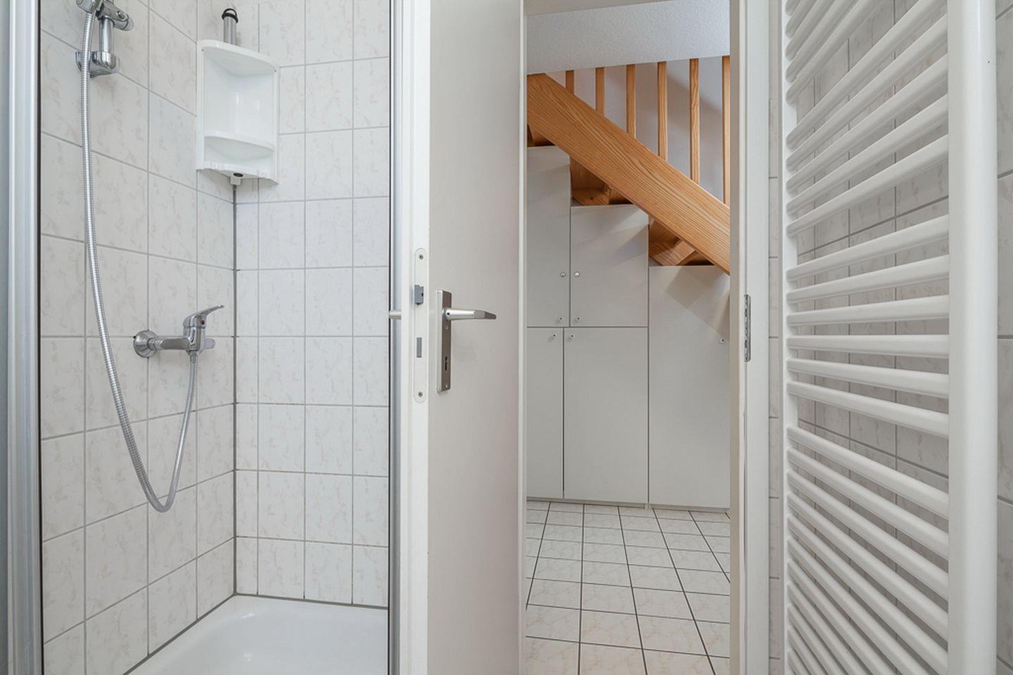 In diesem Ferienhaus findest du im Erdgeschoss ein Duschbad mit Waschmaschine, Föhn und Spiegelschrank mit Vergrößerungs-Spiegel. Im Obergeschoss nutzt du ein Gäste-WC und Waschbecken mit einem Vergrößerungsspiegel sowie ein Föhn. In einem Stauraum findest du den Kinderhochstuhl sowie Terrassen-Sitzauflagen vor.