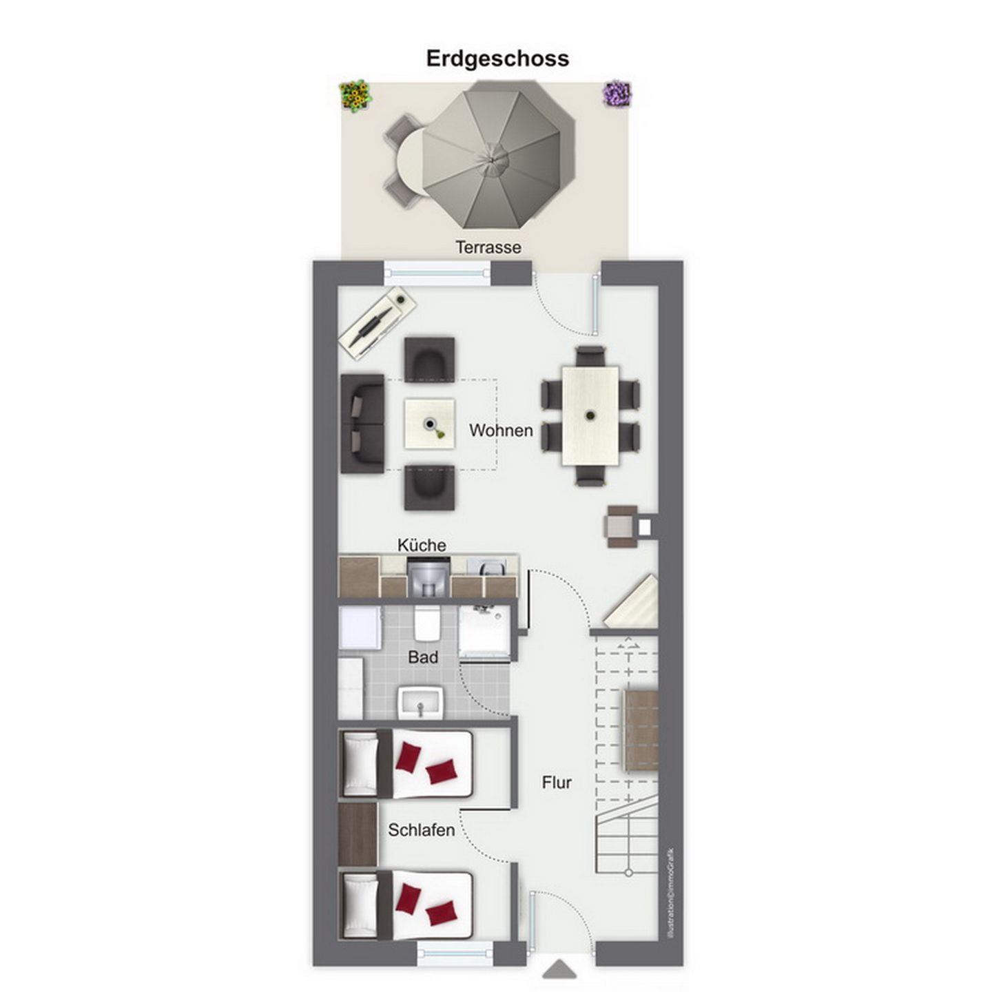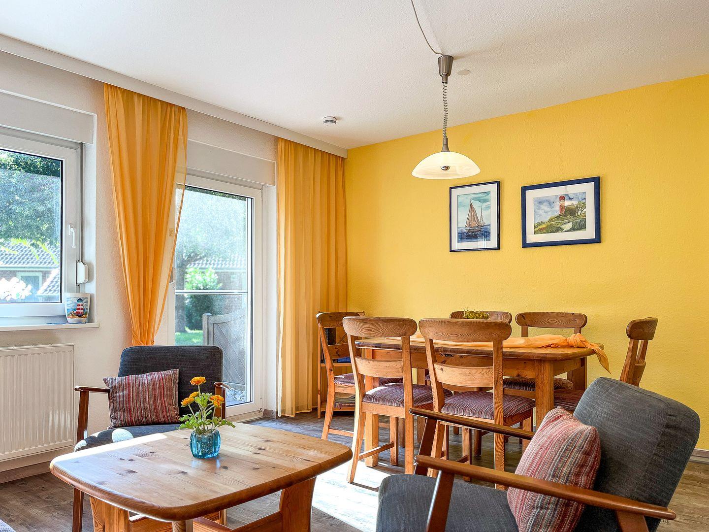 Der helle Wohnraum verfügt über eine gemütliche Sitzecke und einen kleinen Couchtisch sowie eine Essecke mit ausziehbarem Esstisch und 6 Stühlen. Ein Flachbildschirm, DVD-Player und eine Stereoanlage bieten abwechslungsreiche Unterhaltung. Auch eine kleine Auswahl an Spielen und Büchern steht dir zur Verfügung. Eine Doppelschlafcouch (160 x 190 cm) kann von 2 Personen als Schlafplatz genutzt werden. Die große Terrasse ist zur Südwest-Seite ausgerichtet und mit Tisch und 6 verstellbaren Klappstühlen möbliert. Die Markise darüber spendet Schatten, wann immer du willst. Zwei Sonnenliegen sind vorhanden. Die kleinere Terrasse im Eingangsbereich des Ferienhauses lädt mit ihrer Bank zum Sitzen ein. Ein Schlafzimmer mit zwei Einzelbetten (je 90 x 200 cm) und Kleiderschrank befindet sich ebenfalls im Erdgeschoss.