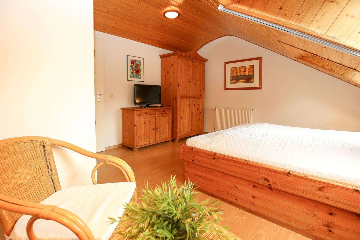 Im Obergeschoss des Ferienhauses befindet sich 1 Schlafzimmer. Dieses Schlafzimmer bietet ein komfortables Doppelbett (2 x 90 x 200 cm) sowie einen geräumigen Kleiderschrank. Eine kleine Sitzecke mit zwei Korbsesseln und Tisch, dimmbare Leselampe und ein Flachbild-TV laden zusätzlich zum Relaxen ein. Beide Velux-Fenster haben Verdunkelungs-/Hitzeschutz-Rollos.
