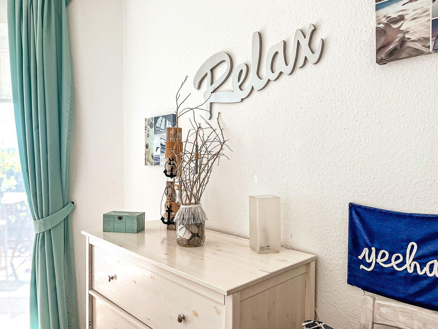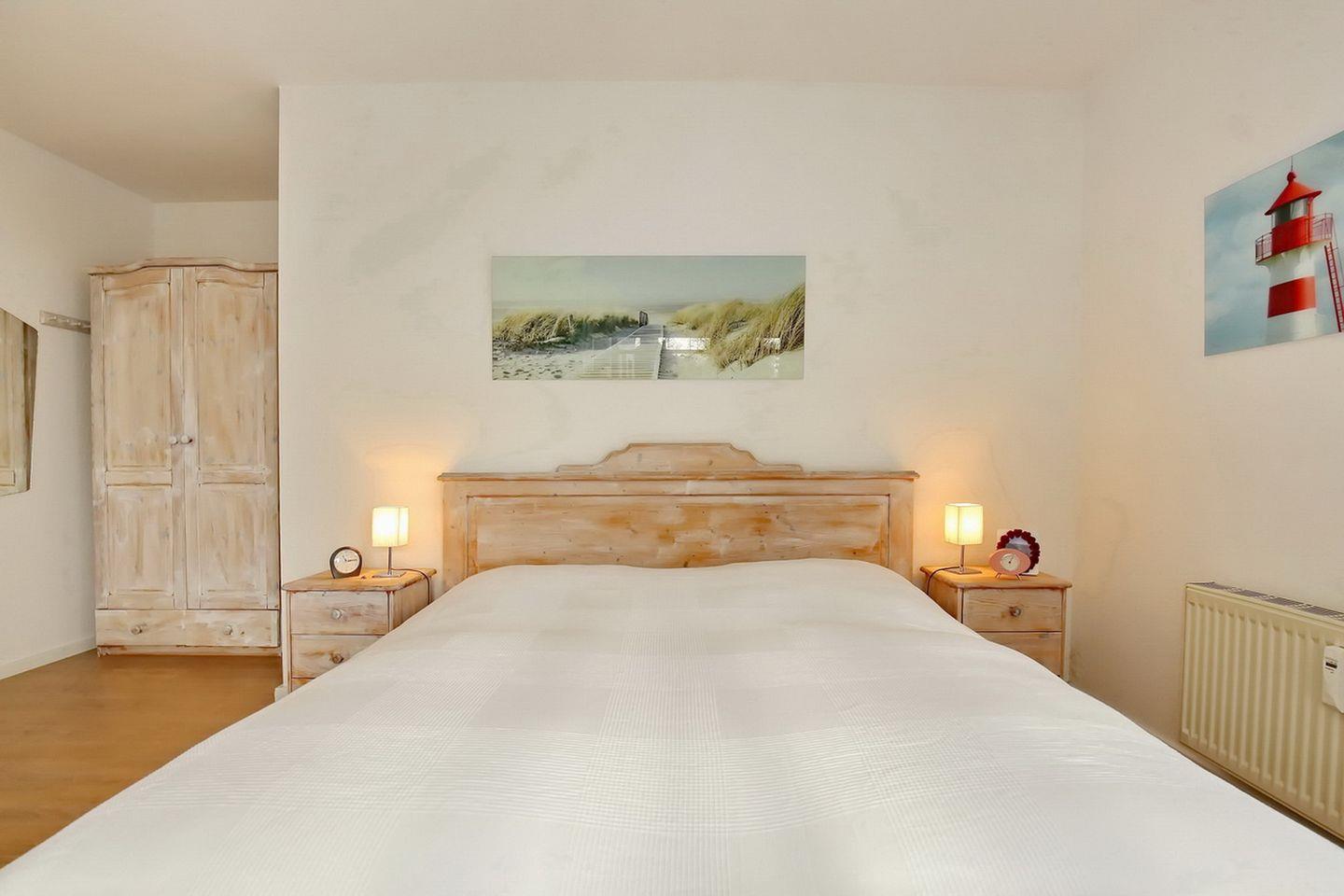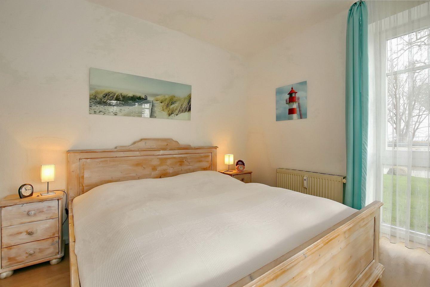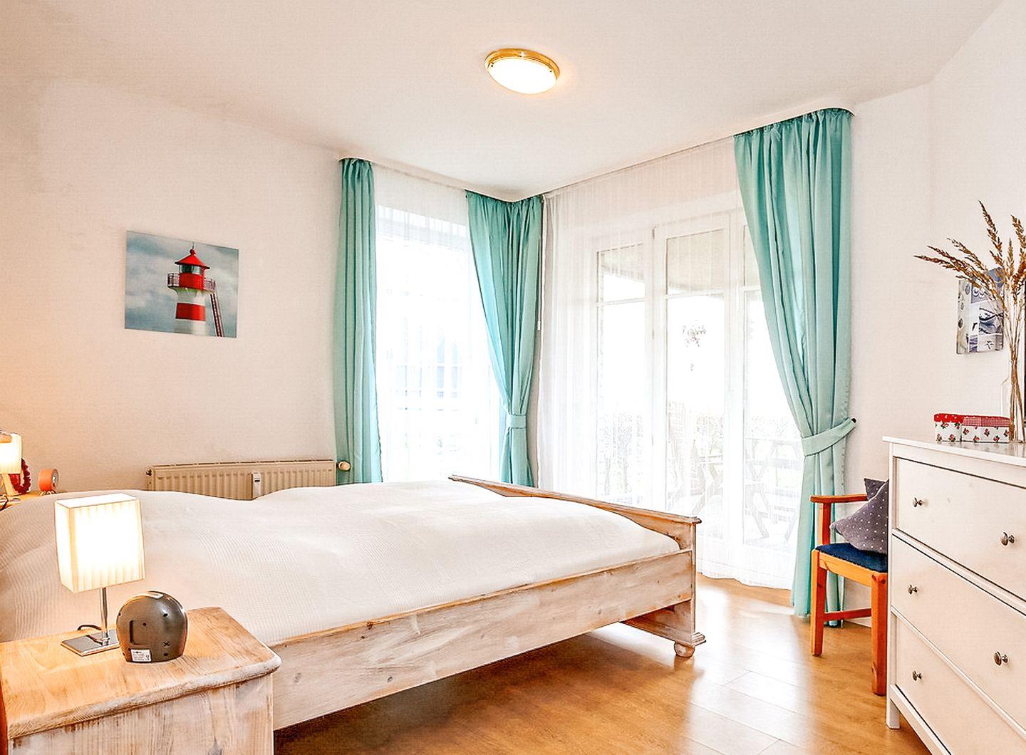 Im Schlafzimmer stehen ein großes Doppelbett (2 x 90 x 200 cm) mit Nackenstützkissen und ein Kleiderschrank für deine Urlaubsgarderobe bereit. Der Bodenbelag ist Laminat.