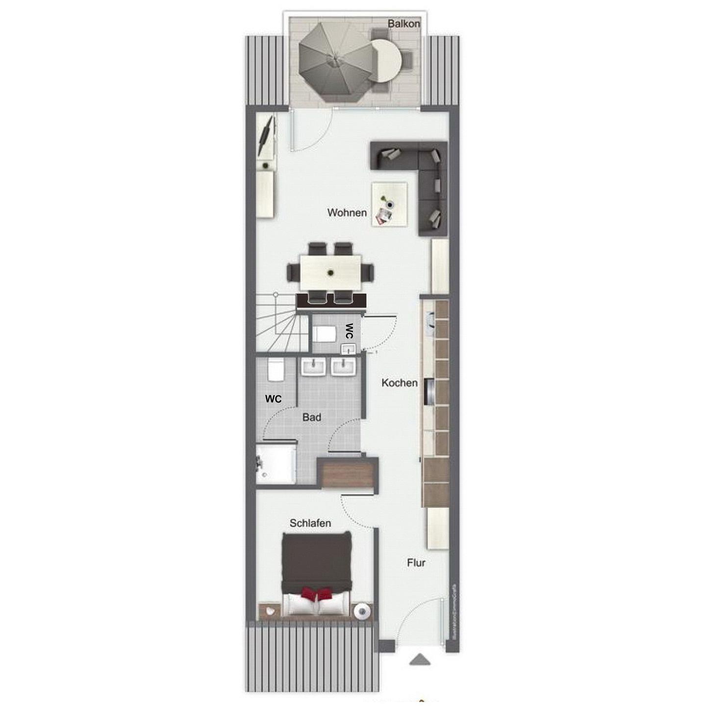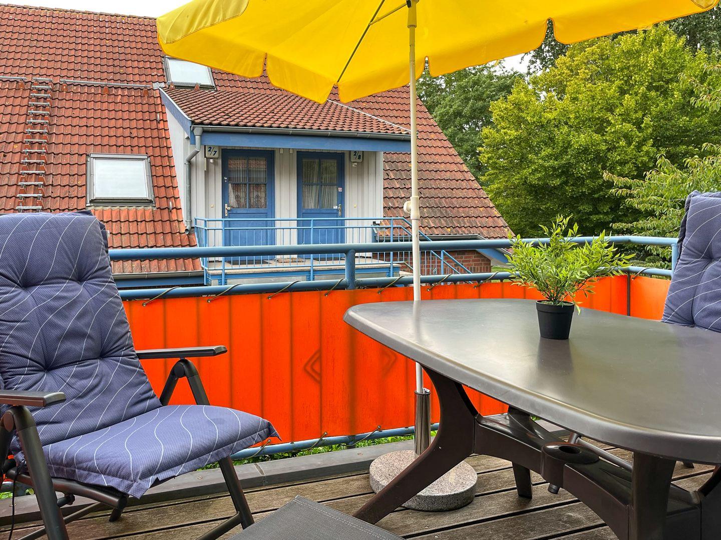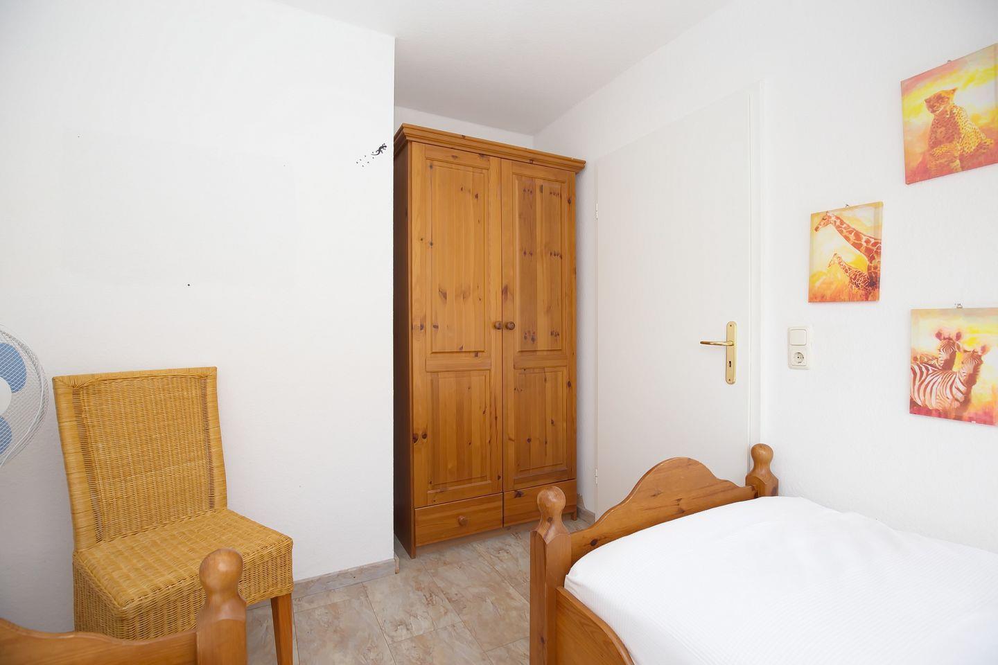 Du erreichst die 4-Zimmer-Wohnung mit einem Balkon in Süd-West Lage über eine Außentreppe. Auf ca. 68 m² Wohnfläche verteilen sich zwei Ebenen. Der Wohn- und Essbereich, ein Schlafzimmer, die Küche und das Duschbad befinden sich auf der ersten Ebene. In die zwei anderen Schlafzimmer gelangst du über eine Treppe vom Wohnbereich aus. Die Ferienanlage Papillon ist etwa 250 m vom Strand entfernt.