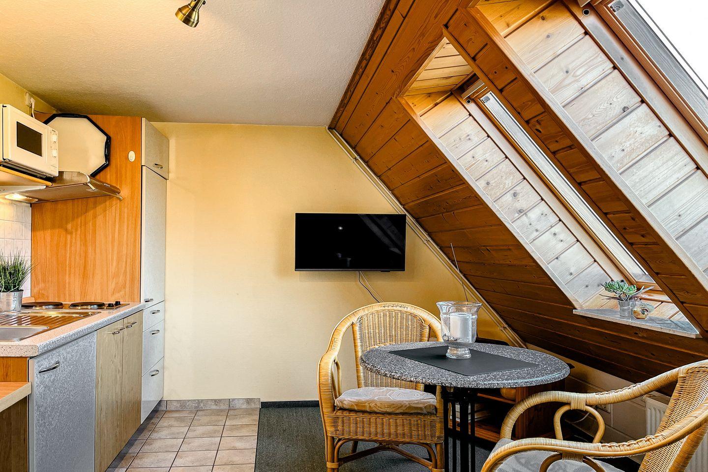 Die kleine, praktische Küche ist mit einem 2-Platten-Herd, eine Mikrowelle, einem Kühlschrank mit Gefrierfach und ausreichend Geschirr ausgestattet. Ein praktischer Essplatz für zwei Personen ist ebenfalls im Wohnbereich integriert.