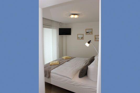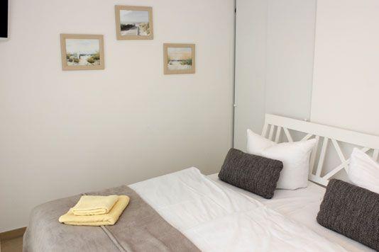 Das separate Schlafzimmer mit komfortablem Doppelbett sorgt für erholsame Nächte und bietet einen ruhigen Rückzugsort nach einem Tag am Strand.