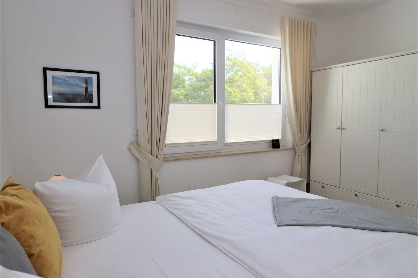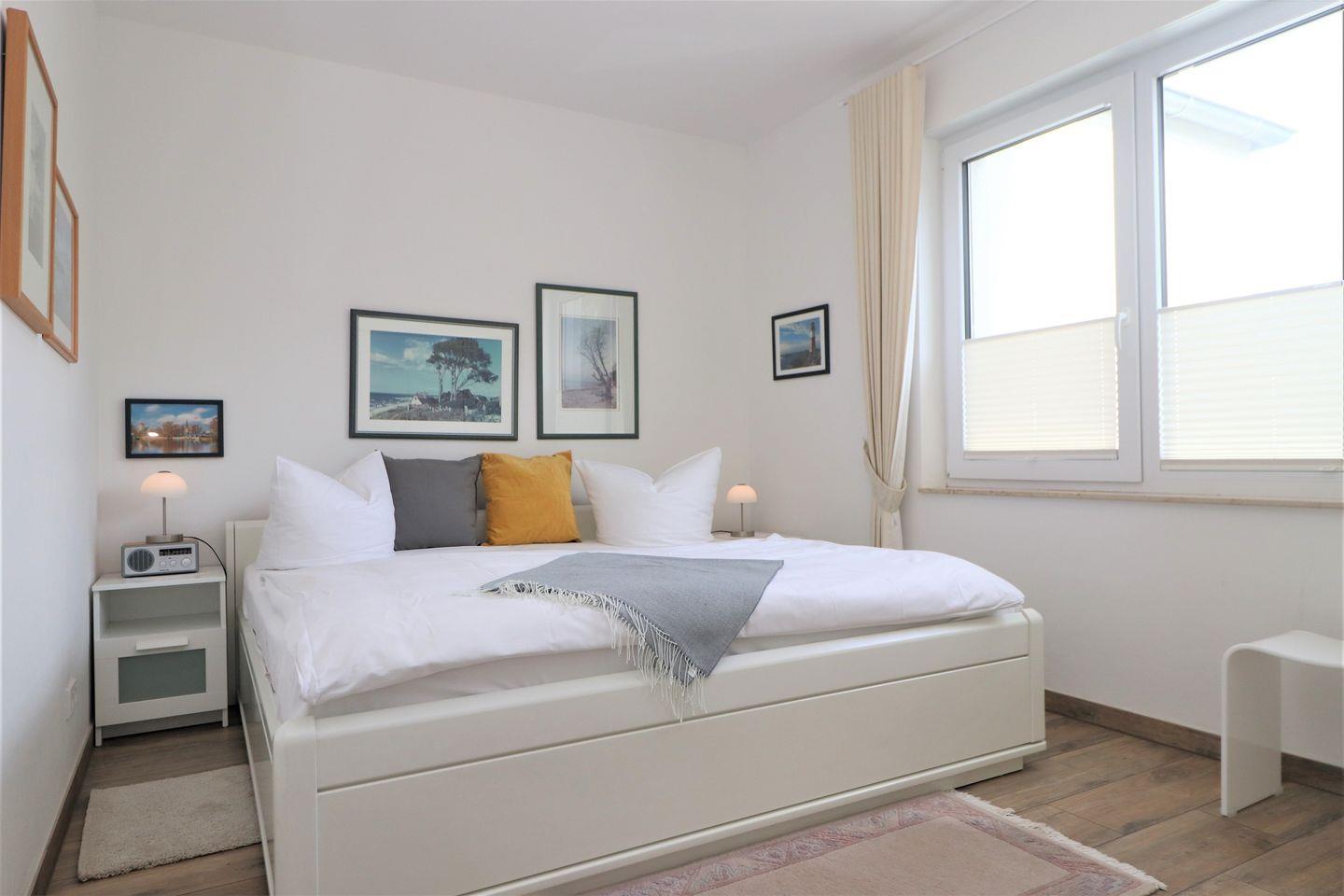 Das separate Schlafzimmer mit komfortablem Doppelbett bietet einen ruhigen Rückzugsort für erholsame Nächte nach einem Tag am Meer.