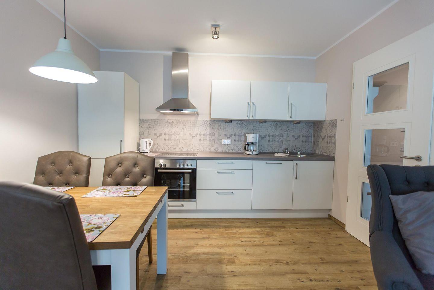 Küchenzeile im Wohnraum mit Ceranfeld, Bachofen, Geschirrspüler, Kühlschrank mit Gefrierfach