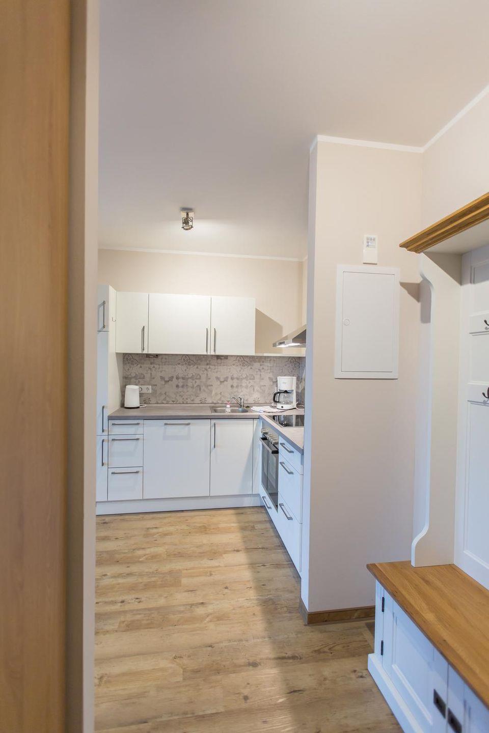 Küchenzeile im Wohnraum mit Ceranfeld, Backofen, Geschirrspüler, Kühlschrank mit Gefrierfach