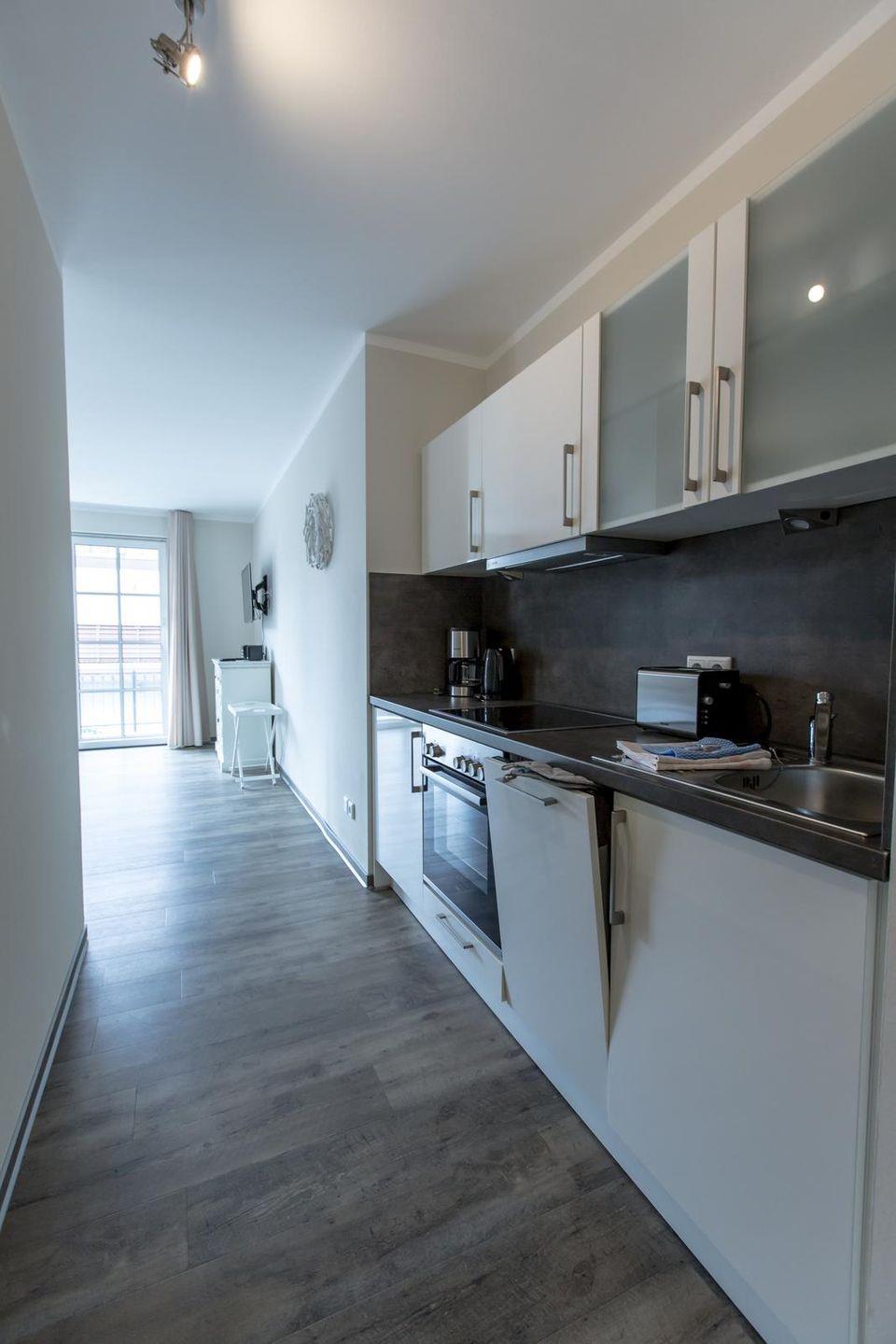 Offene Küchenzeile im Wohnraum mit Ceranfeld, Backofen, Geschirrspüler, Kühlschrank mit Gefrierfach