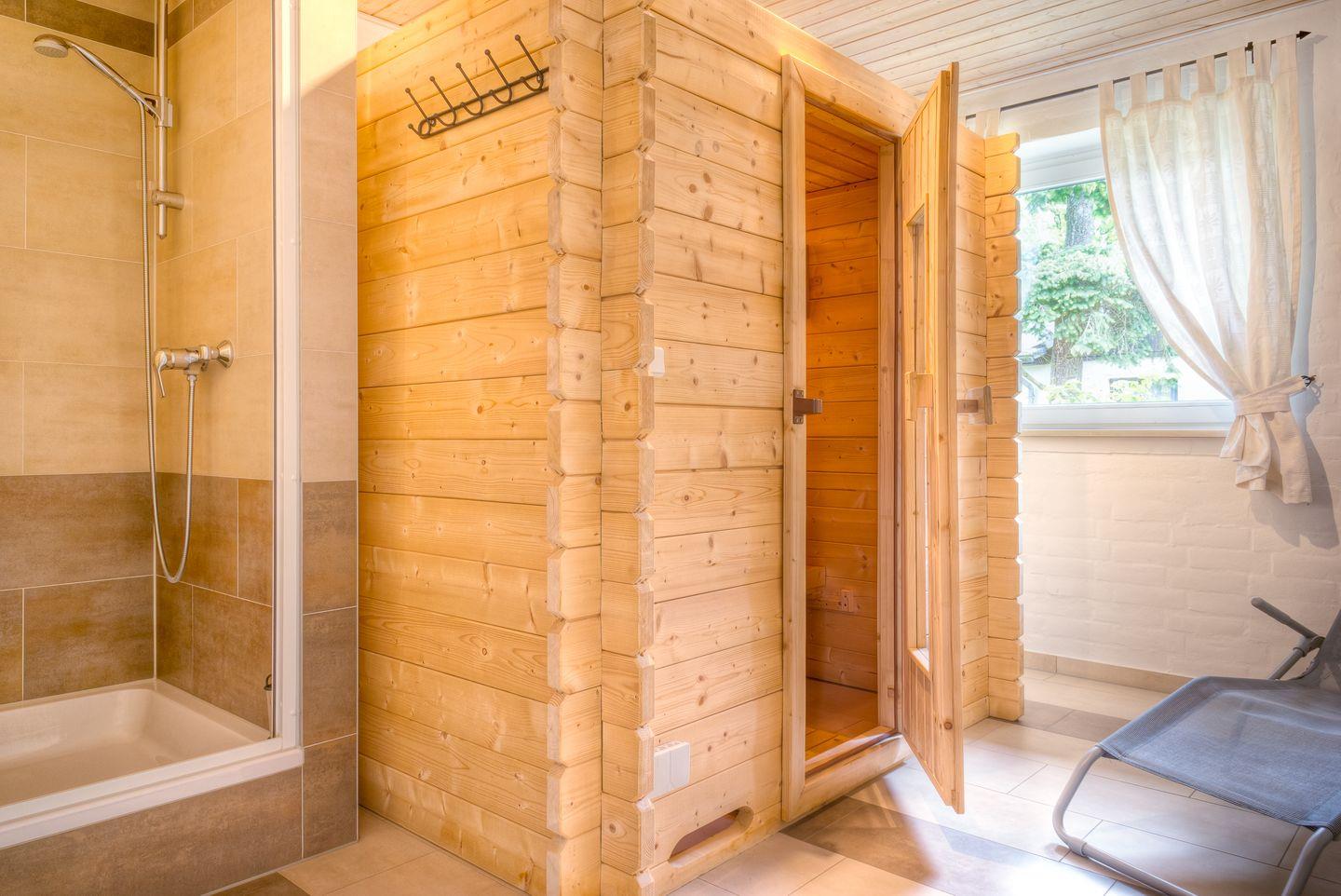 separate Sauna mit angrenzender Dusche und 2 Relax-Liegen