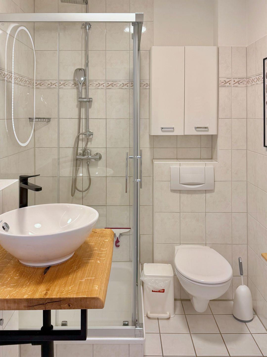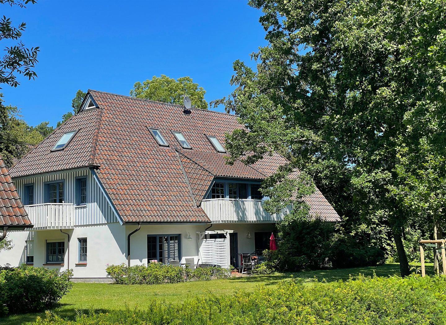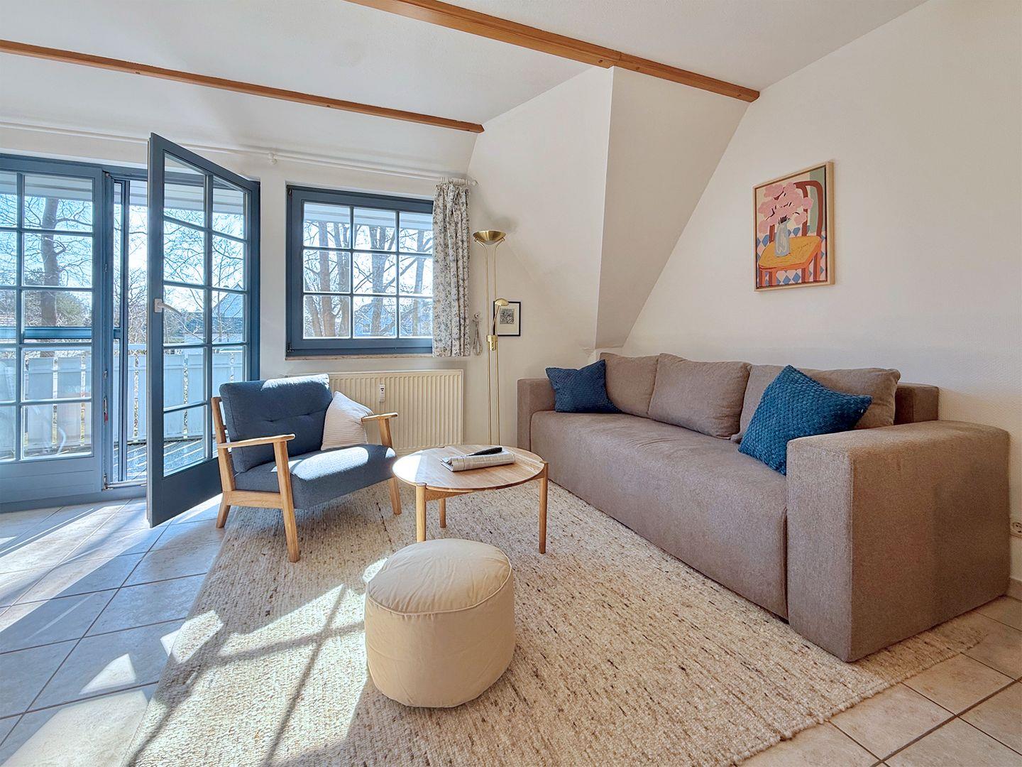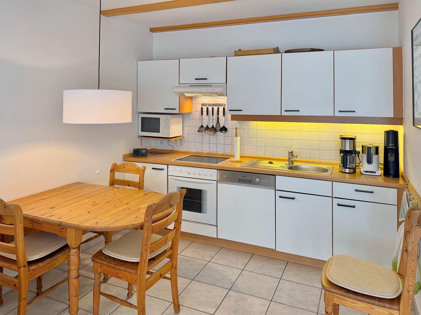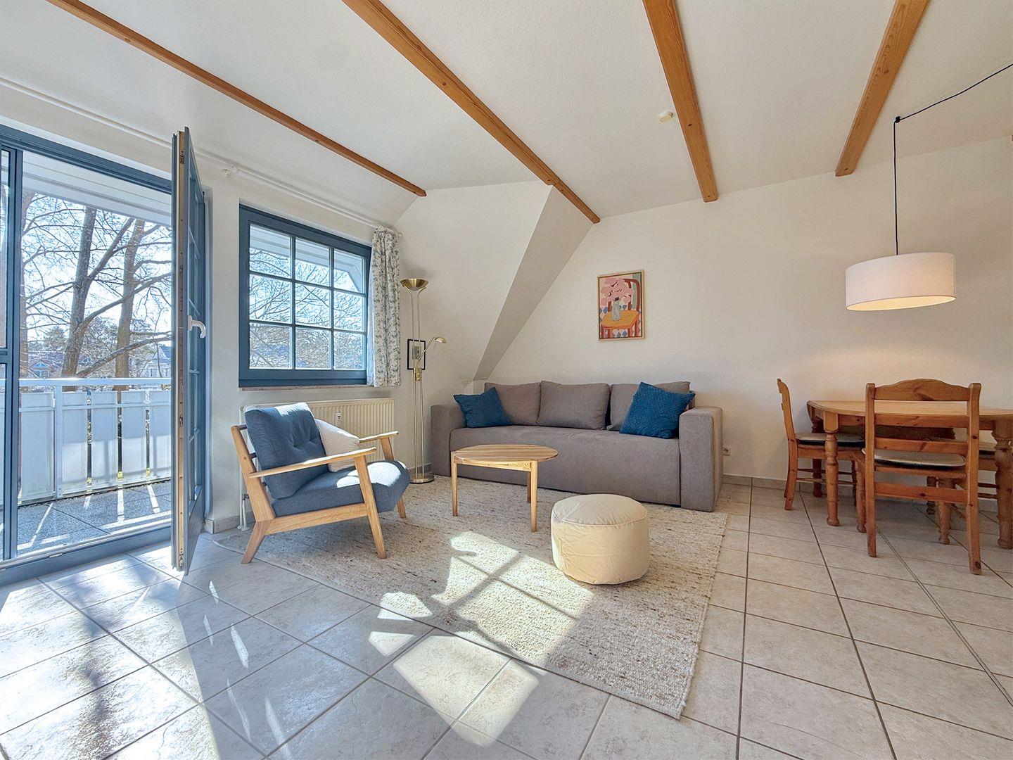 Die helle und geschmackvoll eingerichtete Ferienwohnung "Eichen-Deck" für bis zu 4 Personen bietet auf ca. 40 m² im Obergeschoss eine hochwertige Ausstattung für gehobene Ansprüche. Gelegen im idyllischen Eichenpark direkt am Wald, erreichen Sie den Strand nach einem entspannten, ca. 800 m langen Spaziergang durch die Natur. Den Mittelpunkt Ihrer Unterkunft bildet der sonnendurchflutete Wohnbereich mit einer Einbauküche, einem Esstisch, einem bequemen Schlafsofa in Boxspring-Qualität, einem Radio sowie einem Sat-TV. Die Einbauküche ist mit einem Ceran-Kochfeld, Backofen, Geschirrspüler, Kaffeemaschine, Kühlschrank mit Gefrierfach, Mikrowelle, Toaster, Wasserkocher sowie einem praktischen Wassersprudler ausgestattet und bietet alles, was Sie für die Zubereitung eigener Mahlzeiten benötigen. Das Badezimmer ist mit einer modernen Regen-Dusche und einem WC ausgestattet.