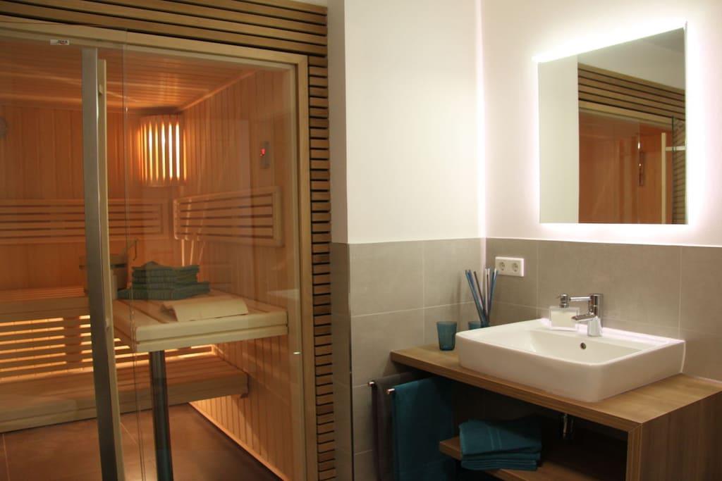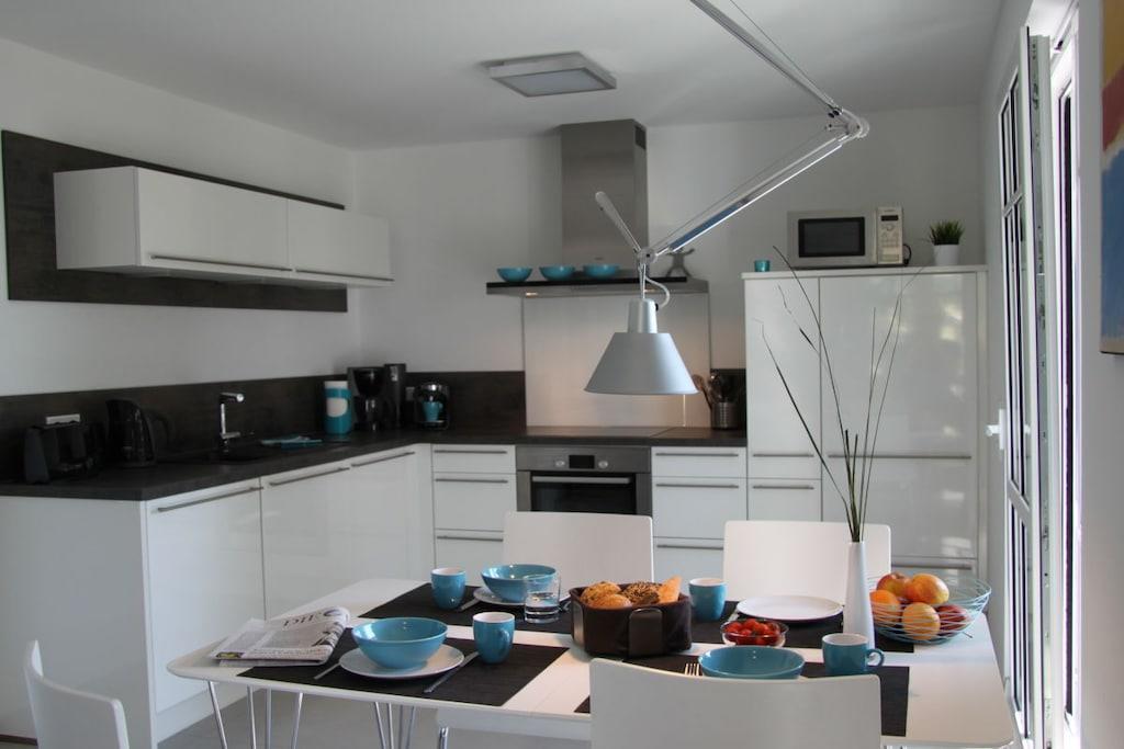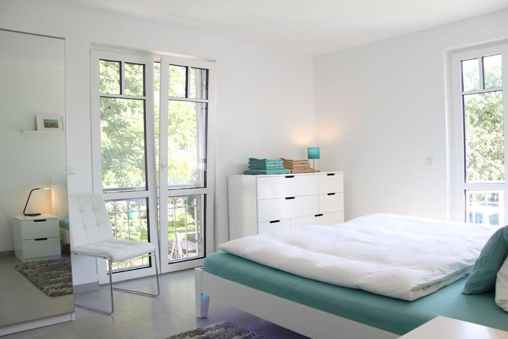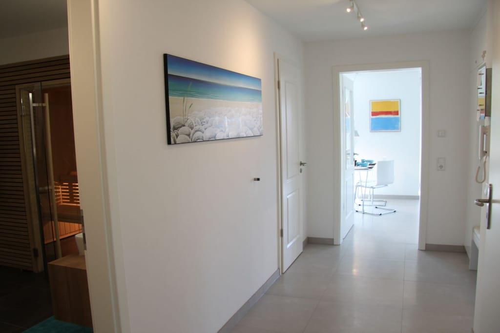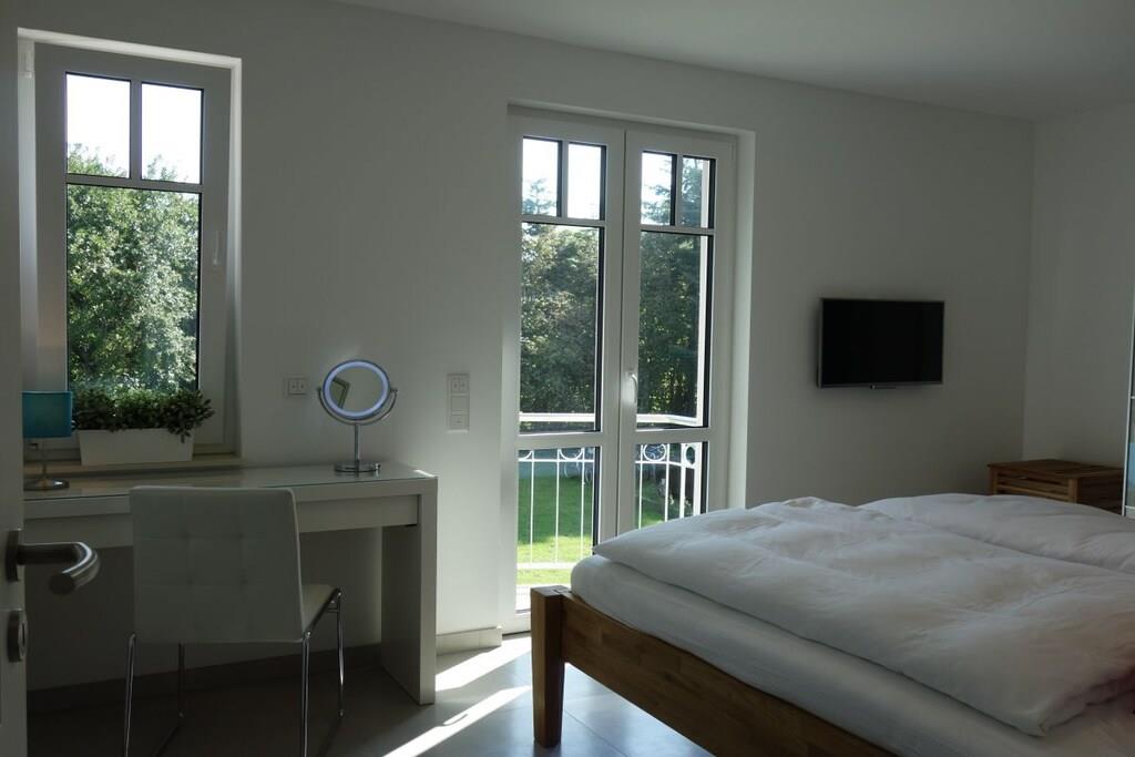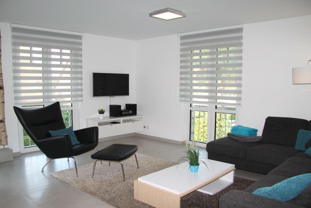 Den romslige ferieleiligheten StrandQuartier Rerik med 3 rom, 2 soverom, åpen stue-spisestue og 2 balkonger ligger i 1. etasje i Strandvilla Luv – rolig, men sentralt beliggende i sentrum og bare 100 meter fra stranden. En finsk badstue er integrert i badet som et design- og velværehøydepunkt. Leilighetens moderne og høykvalitets interiør byr på minimalistisk nordisk design med all komfort. Gulv-til-tak-vinduer skaper en lys atmosfære som understreker det moderne interiøret.