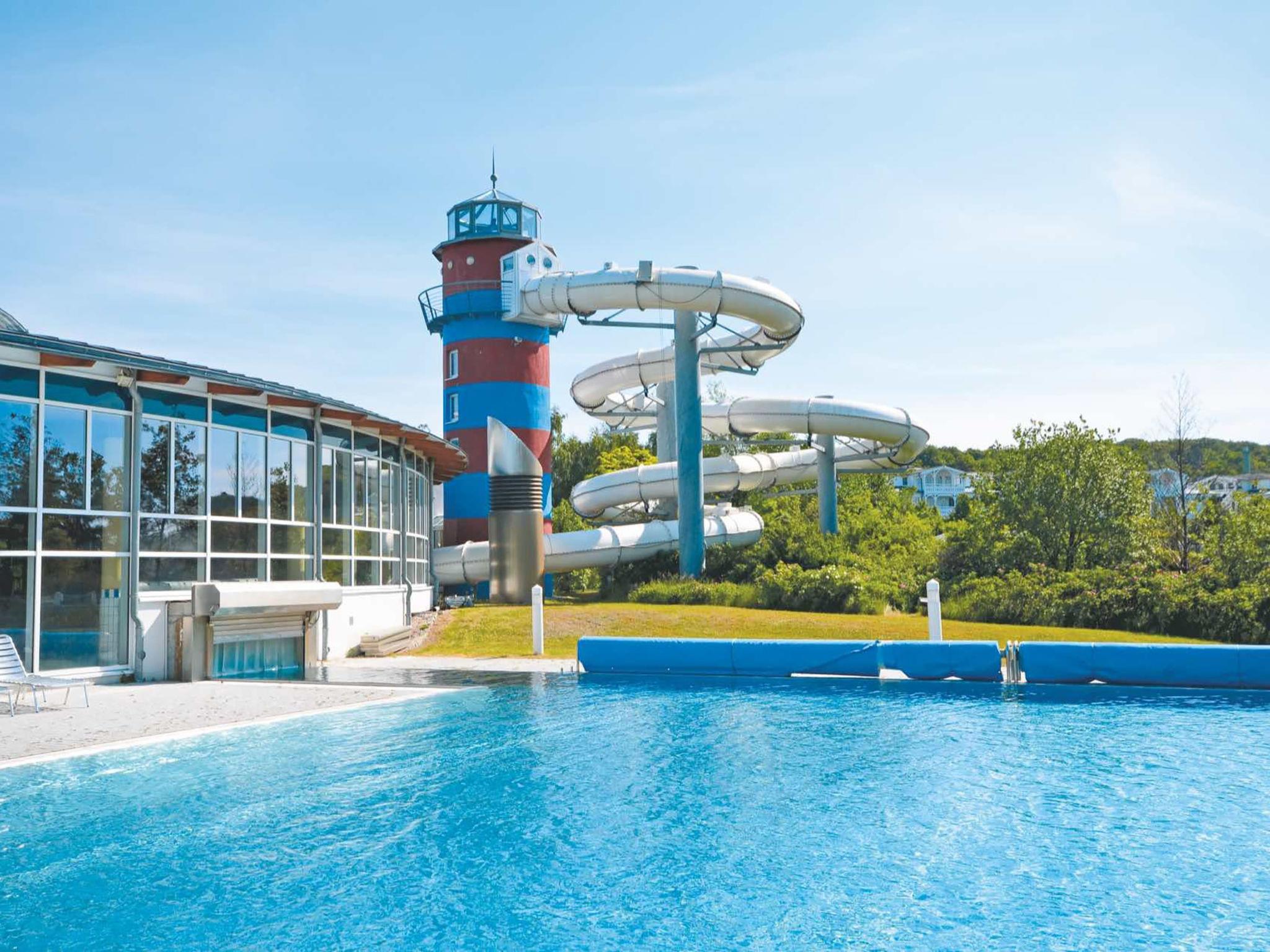Resort "Seepark Sellin", 4 storeys. 8 houses in the residence. 200 apartments in the residence. 800 m from the centre of Sellin, on the outskirts, 8 km from the centre of Göhren, 10 km from the centre of Binz, 800 m from the sea. For shared use: property, well-kept garden with lawn. Table tennis, children's playground. Private: children's playground. In the complex: reception, restaurant, fitness room, table tennis, table football, boutique, storage room for bicycles, central heating system, washing machine (extra), tumble dryer (for shared use, extra), bicycle rental. Bread roll service. Communal covered parking (extra). Supermarket 100 m, bus stop "Sellin, Hauptstrasse" 700 m, railway station "Sellin Ost" 400 m, sandy beach 800 m, indoor swimming pool 100 m. The photo is just an example. All houses/apartments are individually designed/furnished. 3 free SKY channels included. AHOI swimming pool approx. 100m away, discount available at reception.