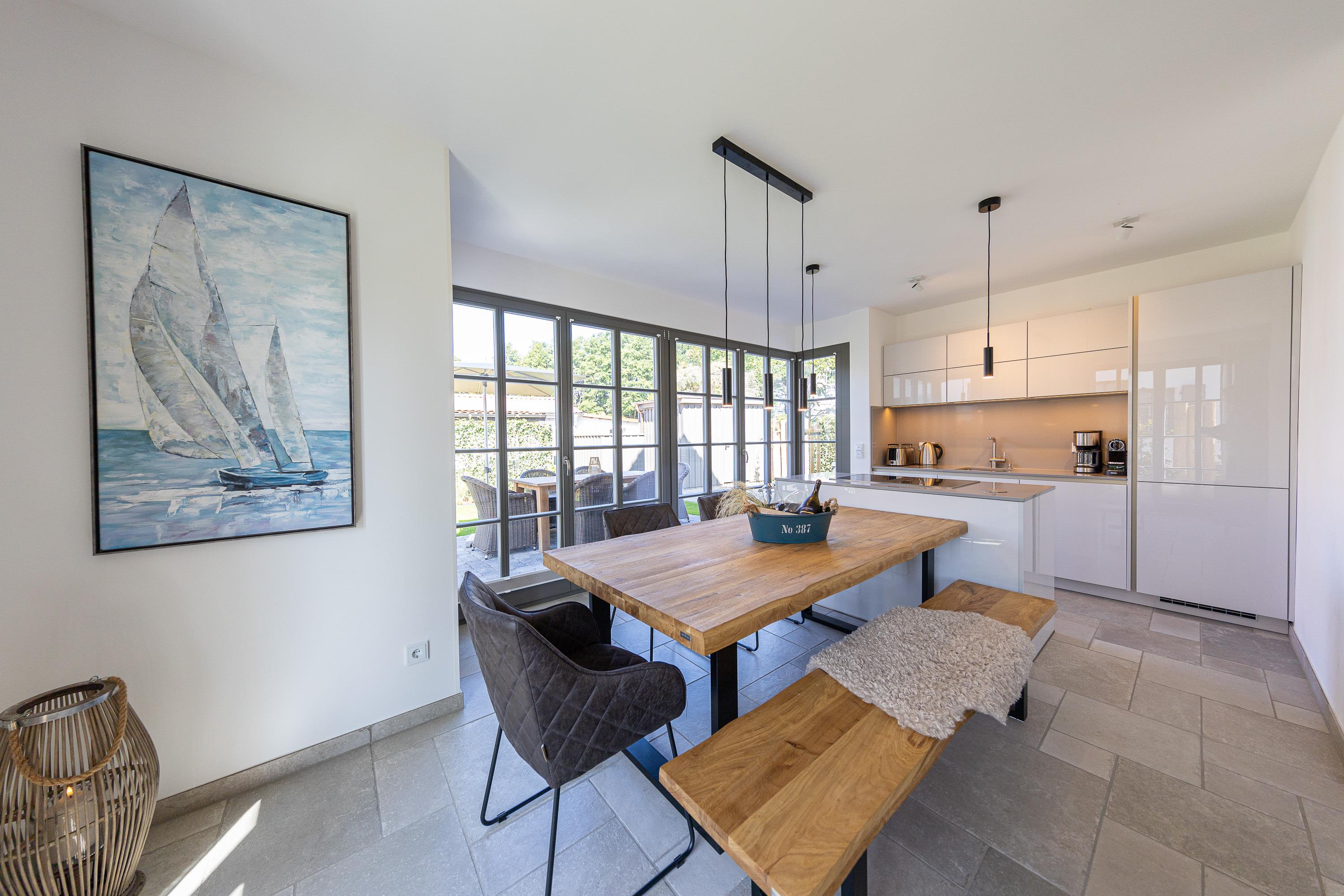 Das Ferienhaus besticht durch seine charmante und einladende Einrichtung. Dies verfügt über eine moderne Wohnküche mit Markengeräten, in der Sie gemeinsame Mahlzeiten zubereiten können. Der angrenzende Essbereich bietet Platz für die ganze Familie und ist der perfekte Ort, um gemeinsam zu essen oder Spieleabende zu veranstalten. Der offene Wohnbereich ist gemütlich und hochwertig ausgestattet und Sie können die Abende am Kamin genießen. Die großen Fenster lassen viel Sonnenlicht herein und schaffen eine angenehme Atmosphäre.