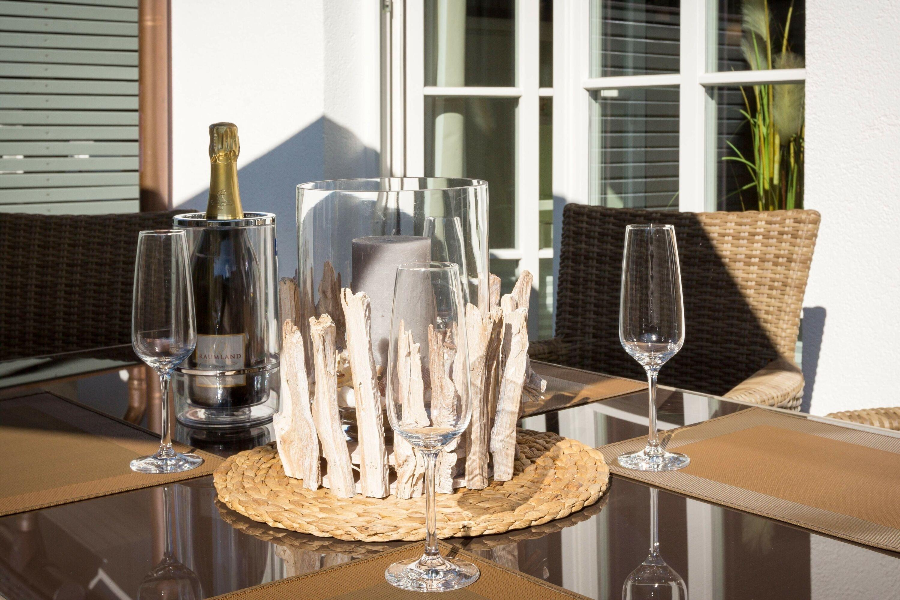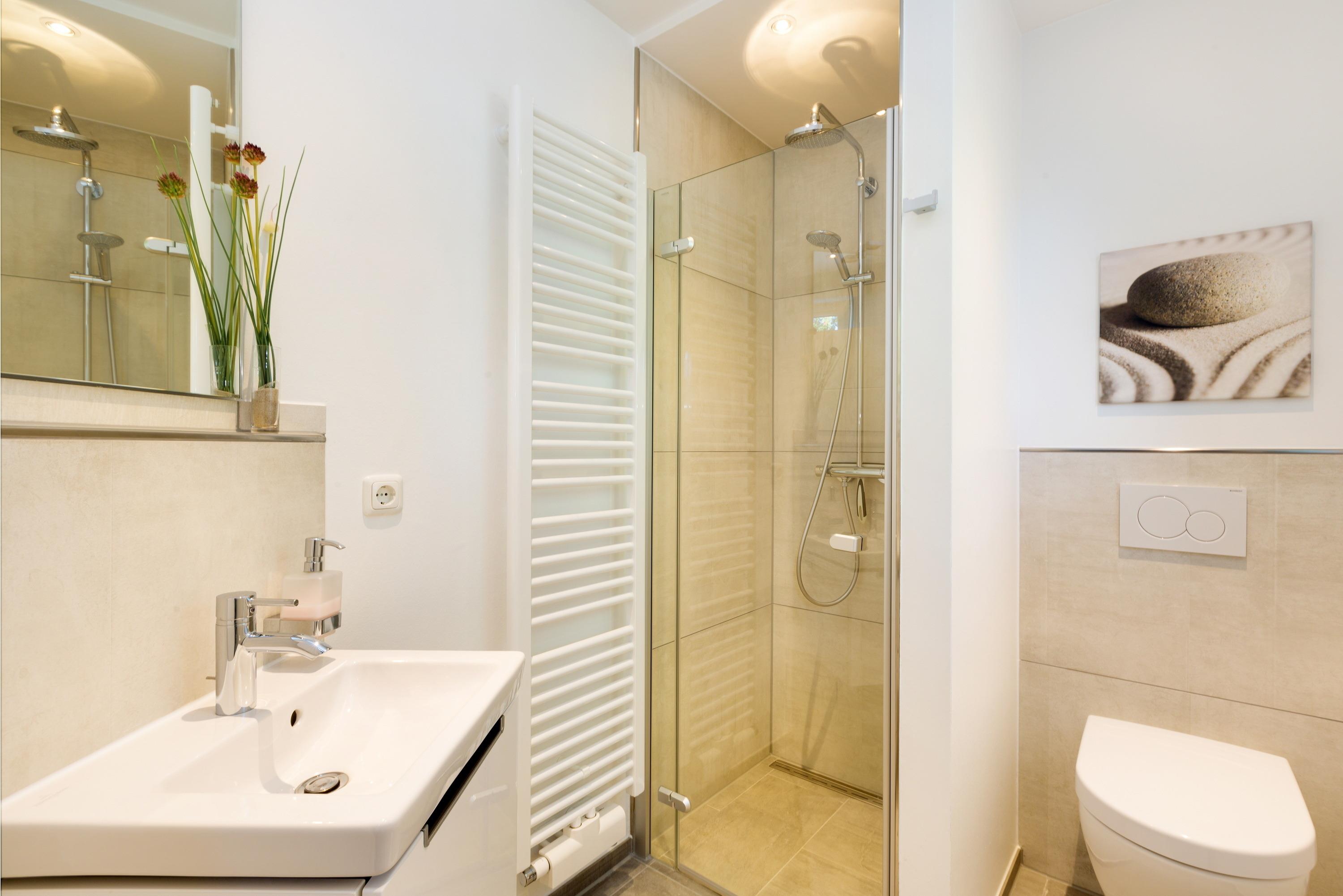 Drei Schlafzimmer bieten Platz für erholsame Nächte: zwei Zimmer sind mit komfortablen Boxspringbetten ausgestattet, das dritte mit zwei Einzelbetten. Verdunkelnde Plissees sorgen für angenehme Ruhe, und in allen Schlafzimmern steht ausreichend Stauraum für Ihr Gepäck zur Verfügung.