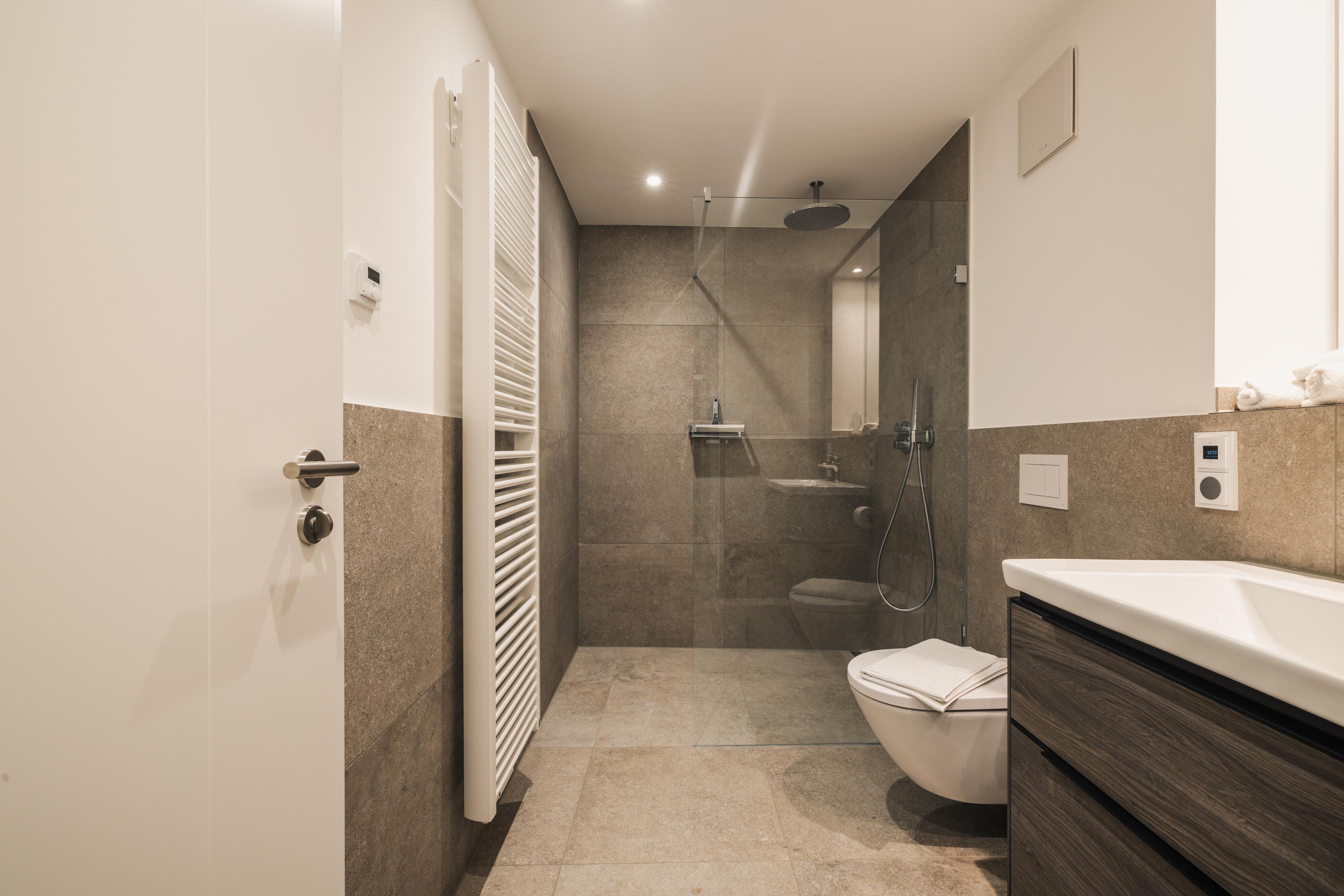 Modernes Bad mit ebenerdiger Dusche und Zugang zur privaten Sauna