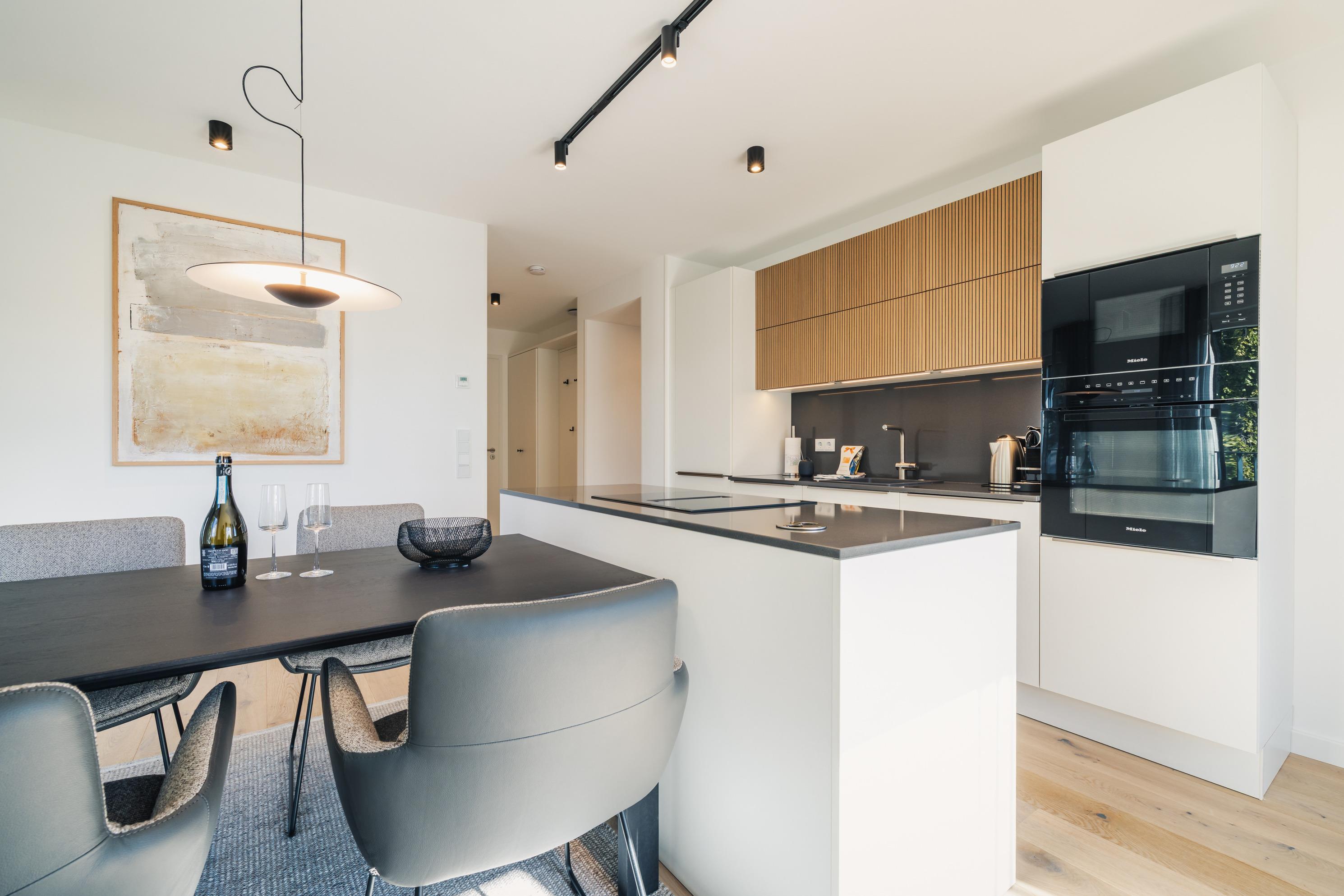Offene, voll ausgestattete Einbauküche mit hochwertigen Markengeräten