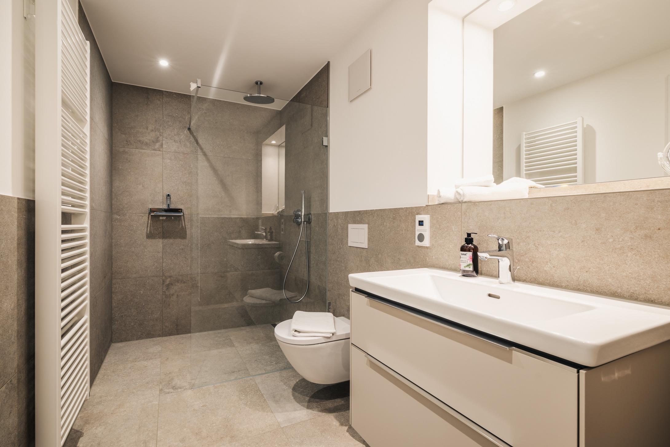 Modernes Bad mit ebenerdiger Dusche und Zugang zur privaten Sauna