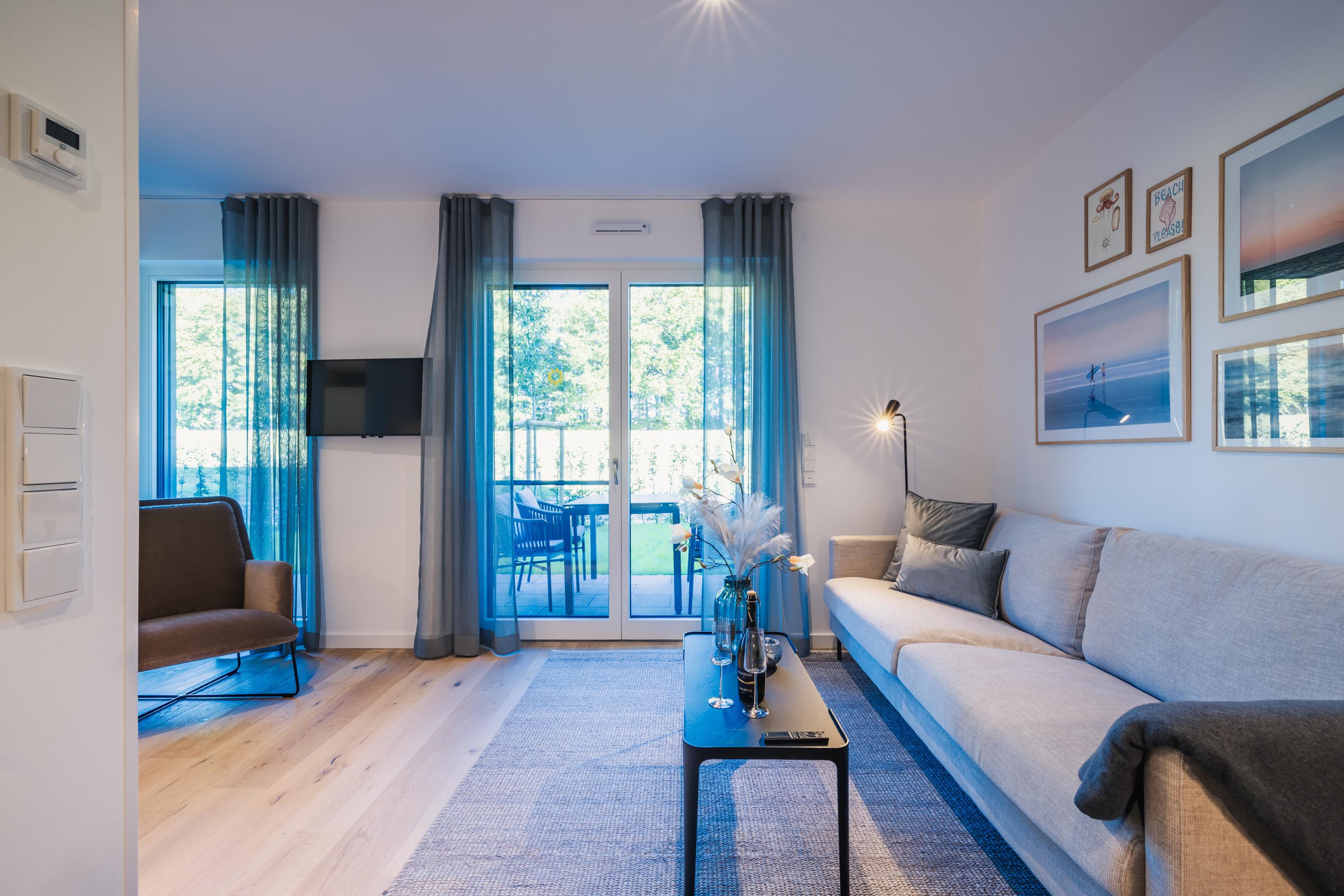 Helles, gemütliches Wohnzimmer sowie Schlafzimmer mit direktem Zugang zur Terrasse und in den Garten