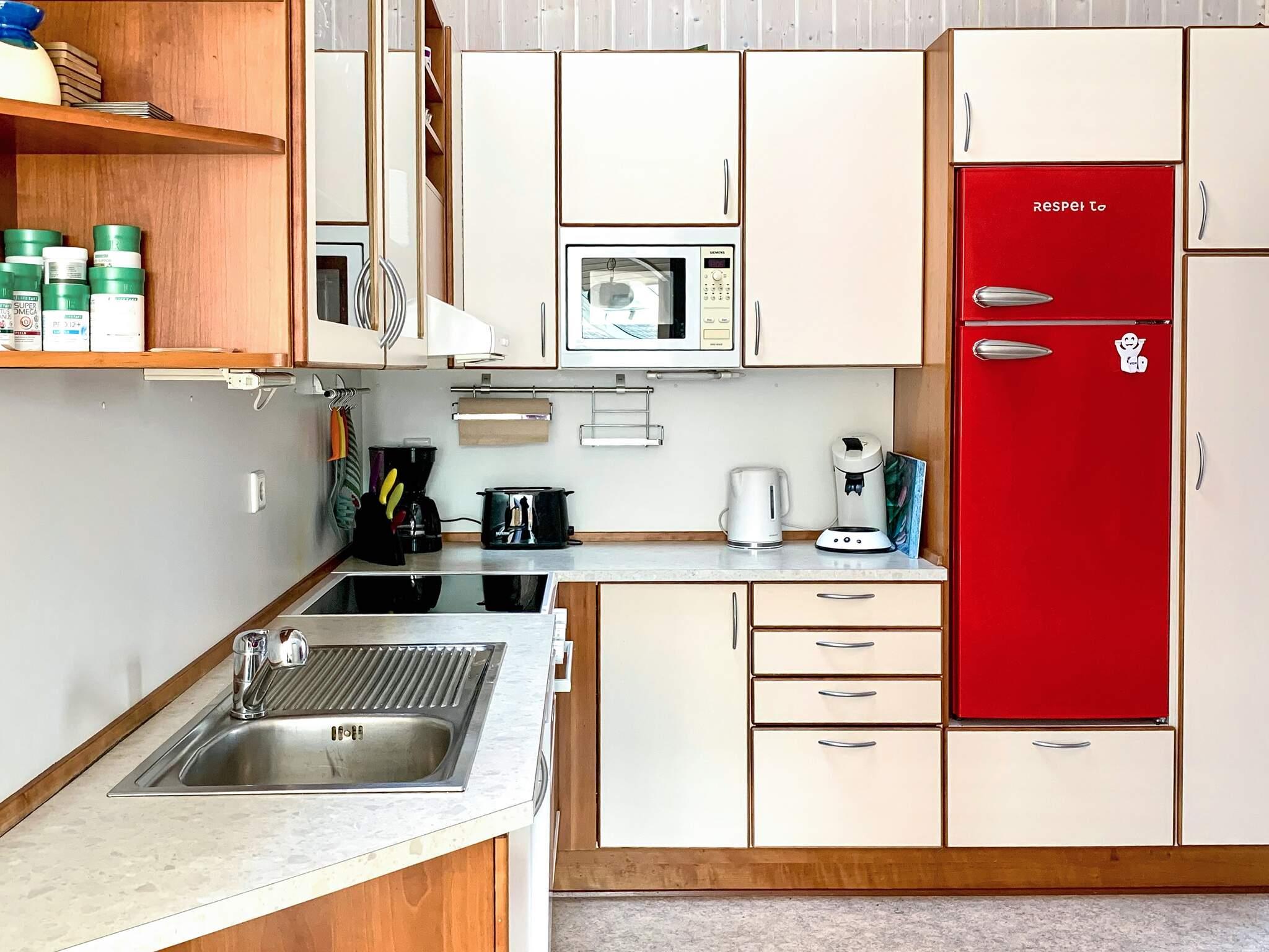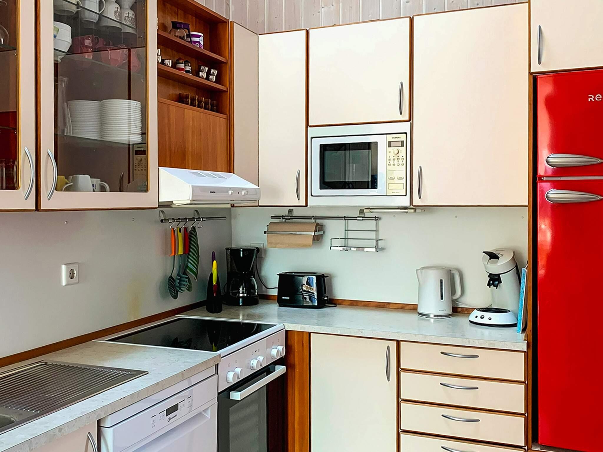 I tilknytning hertil ligger det åbne, moderne udstyrede køkken med bl.a. en Senseo-kaffemaskine. Opvaskemaskinen og køleskabet blev skiftet ud i 2022. Af yderligere udstyr er der liggestole, parasol, muret grill, barneseng og højstol inklusive, boghjørne, spil til store og små, 1000 GB Internet, stort LCD-fjernsyn og dvd-afspiller med film. I soveværelset ved indgangen findes der også et tv. Gulvet i stuen blev skiftet i 2022.